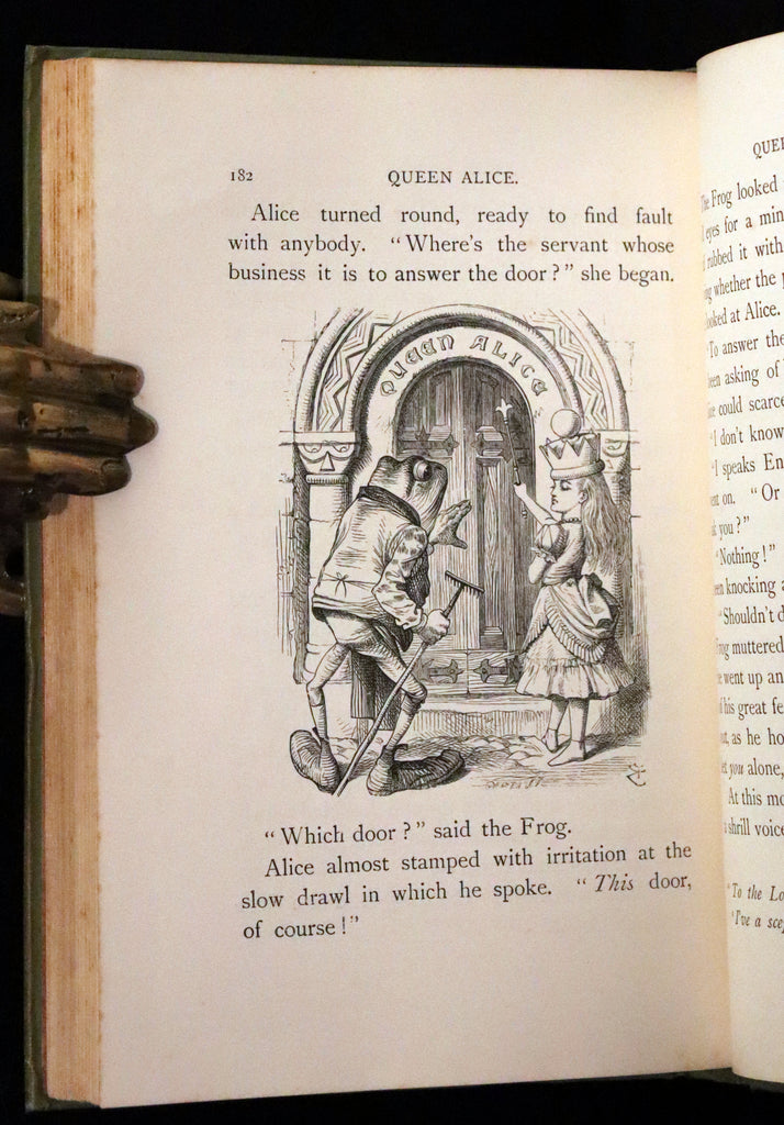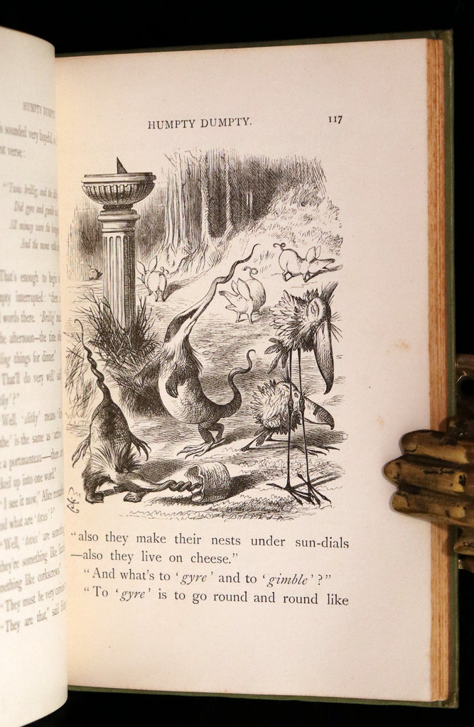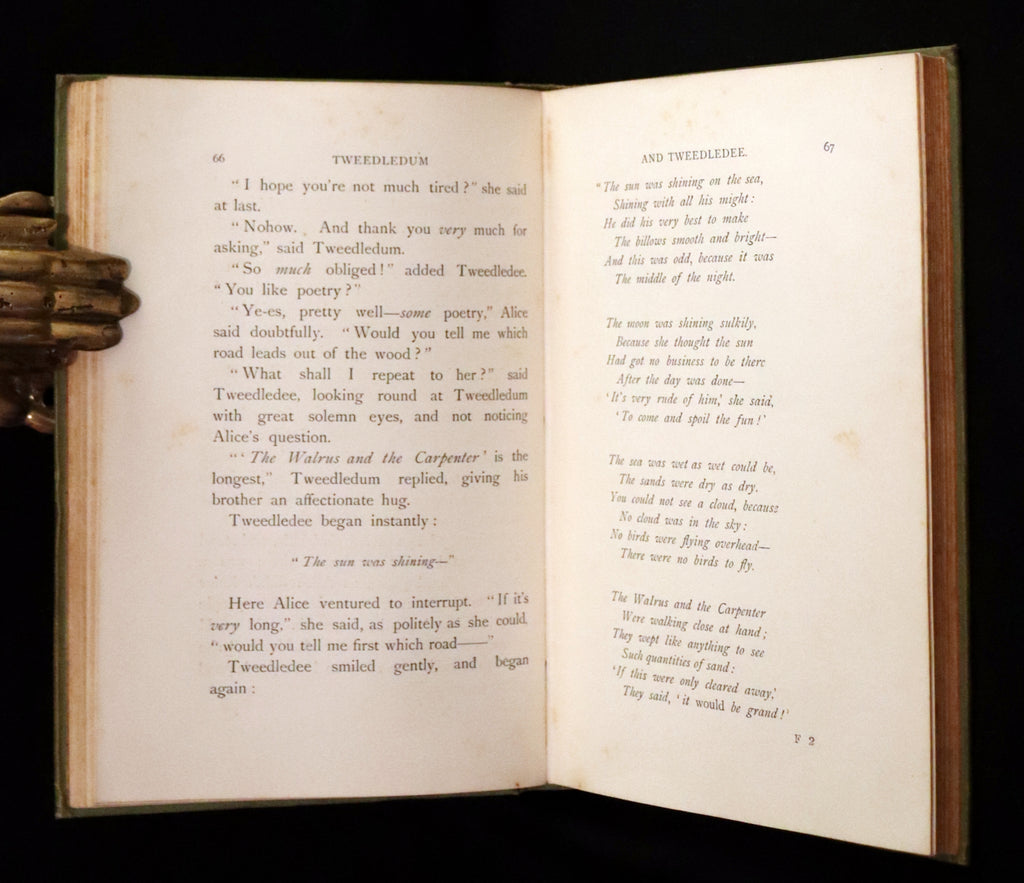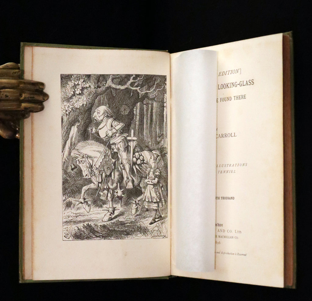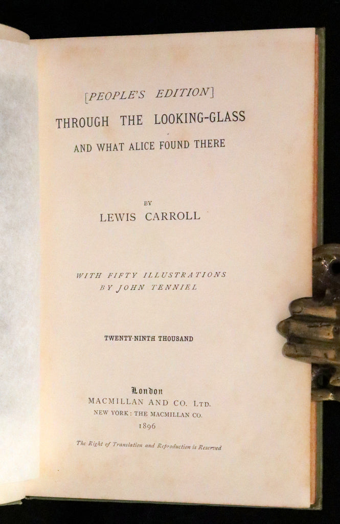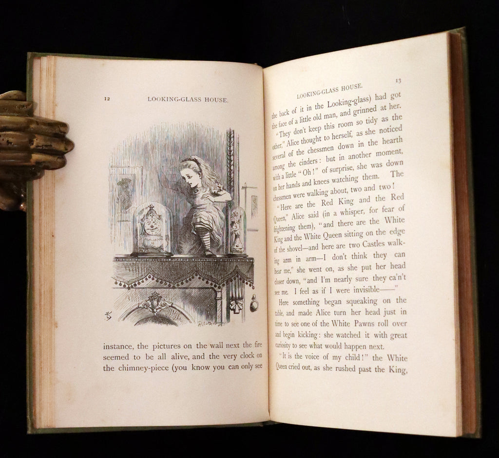 The book: Rare and attractive People's edition of Through the Looking Glass, and What Alice Found There by Lewis Carroll. It is the sequel to Alice's Adventures in Wonderland (1865). Set some six months later than the earlier book, Alice enters a fantastic world this time by climbing through a mirror into the world that she can see beyond it. Through the Looking-Glass includes such celebrated verses as "Jabberwocky" and "The Walrus and the Carpenter," and the episode involving Tweedledum and Tweedledee. The mirror which inspired Carroll remains displayed in Charlton Kings.