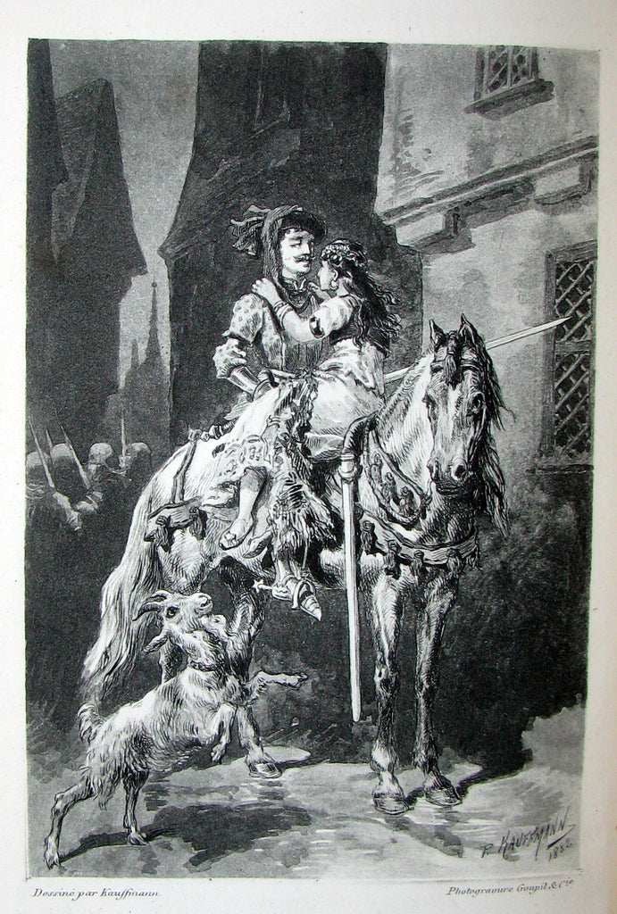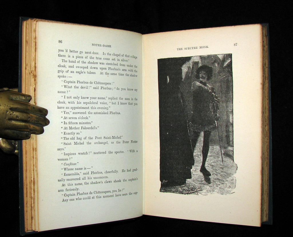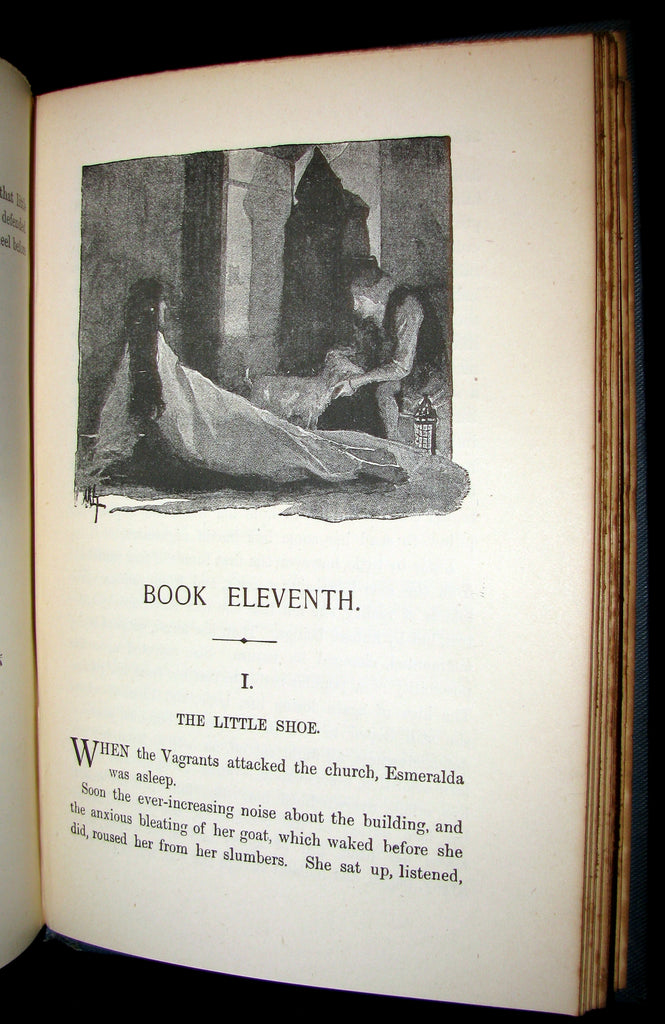 The books : Attractive and rare edition of The Hunchback of Notre-Dame (French: Notre-Dame de Paris, "Our Lady of Paris") - a French Romantic/Gothic novel by Victor Hugo, published in 1831. The novel's original French title, Notre-Dame de Paris, is a metaphor: it refers to Notre Dame Cathedral, on which the story is centered, and Esmeralda, the novel's main character who is "our lady of Paris" and the center of the human drama within the story. Frederic Shoberl's 1833 English translation was published as The Hunchback of Notre Dame (which became the generally used title in English), which refers to Quasimodo, Notre Dame's bellringer.