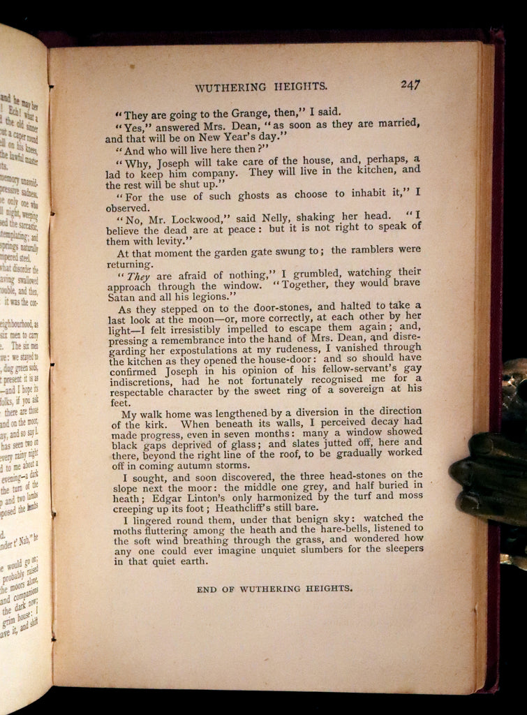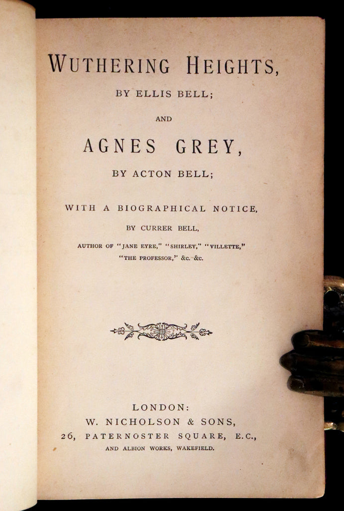 The book: Attractive and scarce edition of Wuthering Heights -- a novel by Emily Brontë published in 1847 under her pseudonym "Ellis Bell". It is her only finished novel. Wuthering Heights and Anne Brontë's Agnes Grey were accepted by publisher Thomas Newby before the success of her sister Charlotte's novel Jane Eyre. After Emily's death, Charlotte edited a posthumous second edition in 1850. Although Wuthering Heights is now a classic of English literature, contemporaneous reviews were deeply polarised; it was controversial because of its unusually stark depiction of mental and physical cruelty, and it challenged Victorian ideas about religion, morality, class, and a woman's place in society.