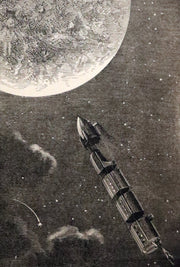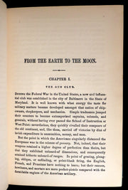 The book: Scarce binding variant and attractive edition of From the Earth to the Moon (French: De la terre à la lune) -- an 1865 novel by Jules Verne. It tells the story of the Baltimore Gun Club, a post-American Civil War society of weapons enthusiasts, and their attempts to build an enormous Columbiad space gun and launch three people—the Gun Club's president, his Philadelphian armor-making rival, and a French poet—in a projectile with the goal of a moon landing. The story is also notable in that Verne attempted to do some rough calculations as to the requirements for the cannon and, considering the comparative lack of any data on the subject at the time, some of his figures are surprisingly close to reality. However, his scenario turned out to be impractical for safe manned space travel since a much longer muzzle would have been required to reach escape velocity while limiting acceleration to survivable limits for the passengers.