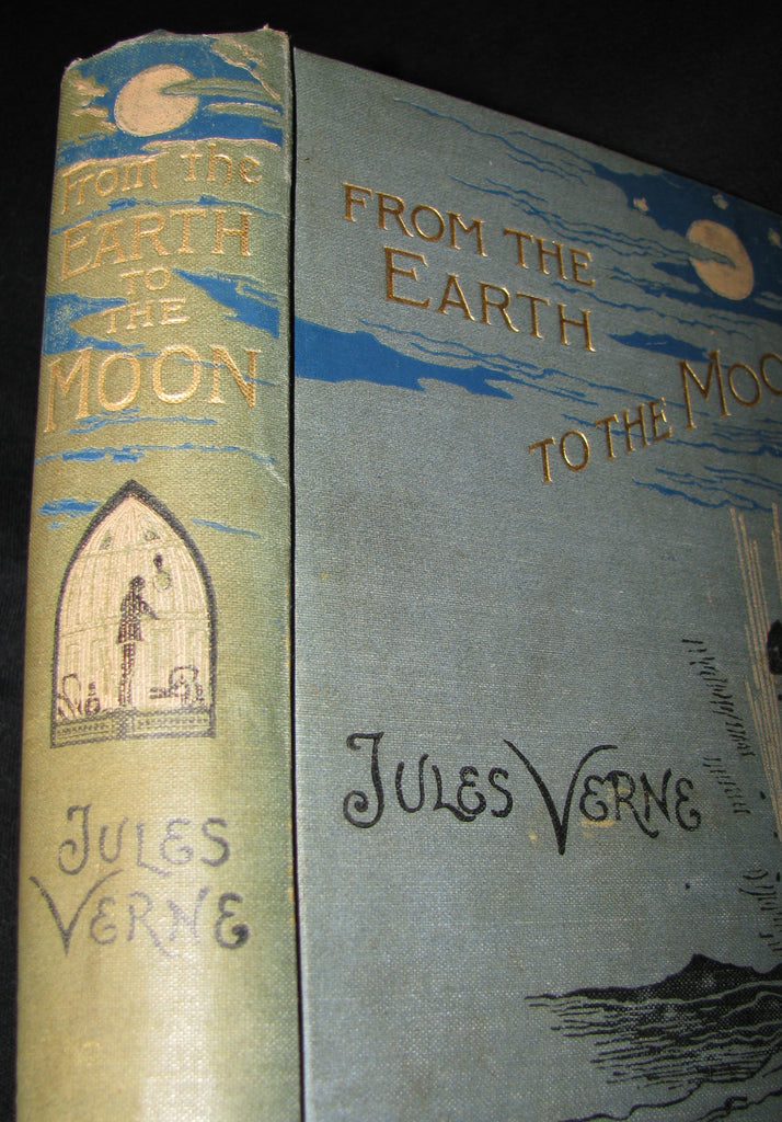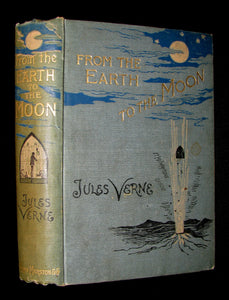 The book : Rare and attractive edition of From the Earth to the Moon (French: De la terre à la lune) is an 1865 novel by Jules Verne. It tells the story of the Baltimore Gun Club, a post-American Civil War society of weapons enthusiasts, and their attempts to build an enormous Columbiad space gun and launch three people—the Gun Club's president, his Philadelphian armor-making rival, and a French poet—in a projectile with the goal of a moon landing. The story is also notable in that Verne attempted to do some rough calculations as to the requirements for the cannon and, considering the comparative lack of any data on the subject at the time, some of his figures are surprisingly close to reality. However, his scenario turned out to be impractical for safe manned space travel since a much longer muzzle would have been required to reach escape velocity while limiting acceleration to survivable limits for the passengers.
