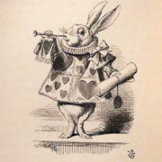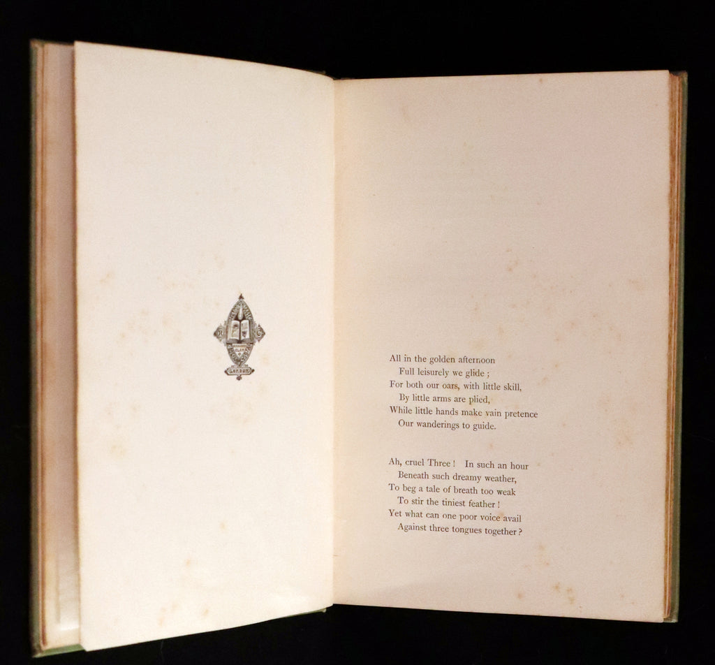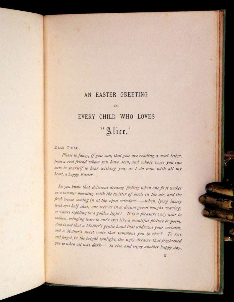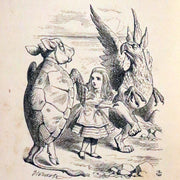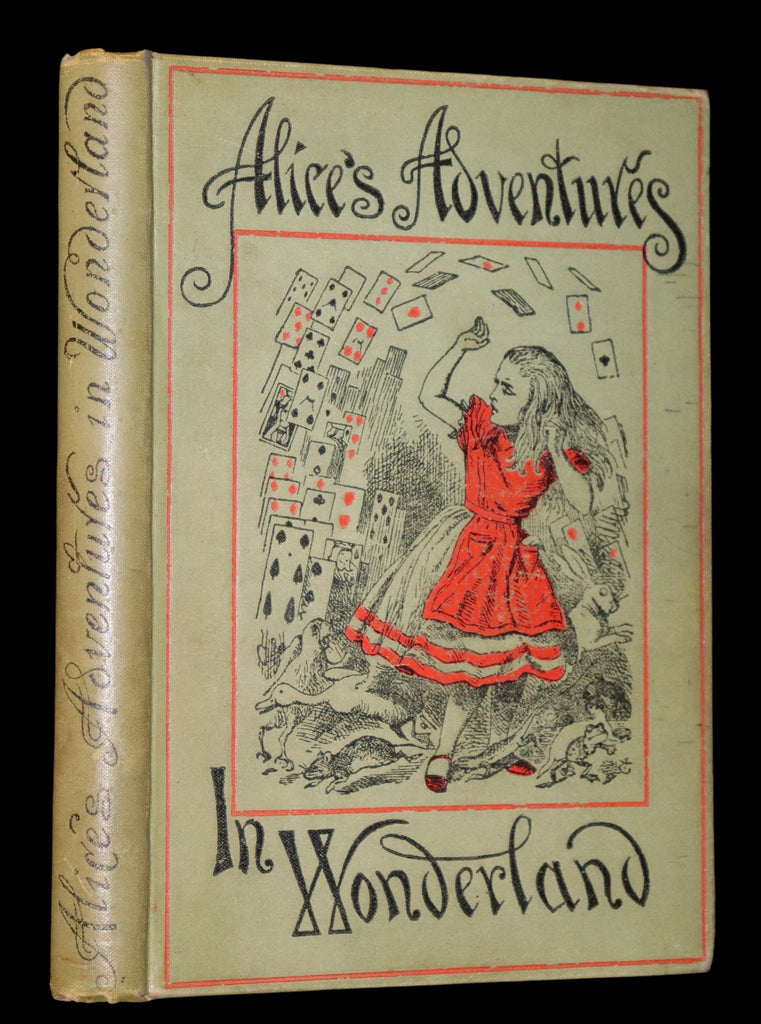 The book: Rare 1896 People's edition of Alice's Adventures in Wonderland (commonly shortened to Alice in Wonderland) -- an 1865 novel written by English author Charles Lutwidge Dodgson under the pseudonym Lewis Carroll. It tells of a girl named Alice falling through a rabbit hole into a fantasy world populated by peculiar, anthropomorphic creatures. The tale plays with logic, giving the story lasting popularity with adults as well as with children. It is considered to be one of the best examples of the literary nonsense genre. Its narrative course and structure, characters and imagery have been enormously influential in both popular culture and literature, especially in the fantasy genre.