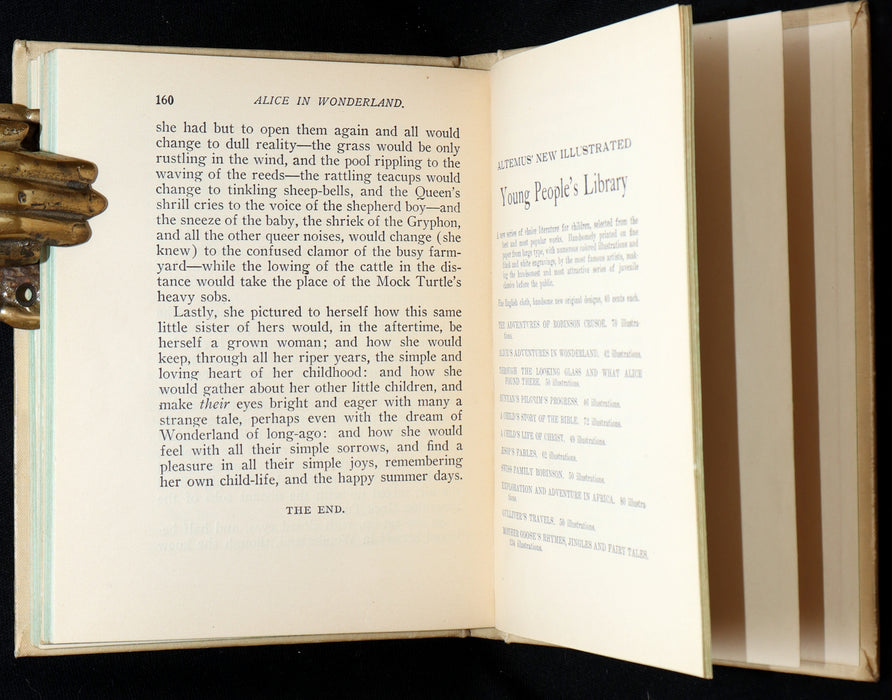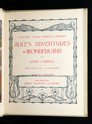 The book: A charming turn-of-the-century American edition of Lewis Carroll’s Alice’s Adventures in Wonderland, issued as part of the “Altemus’ Young People’s Library” series. While not the first American edition, this version—copyrighted 1897 by Henry Altemus—is highly sought after for its boldly stylized art nouveau binding and blend of black-and-white and color illustrations. A delightful collectible copy from a respected publisher of juvenile books in the late 19th century.