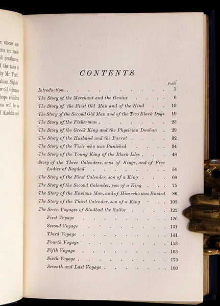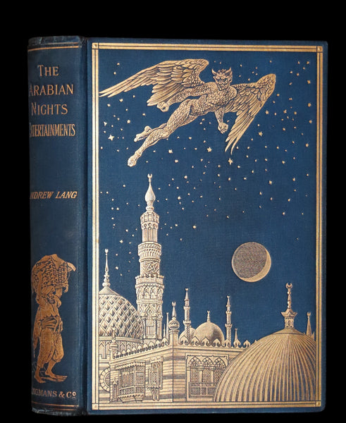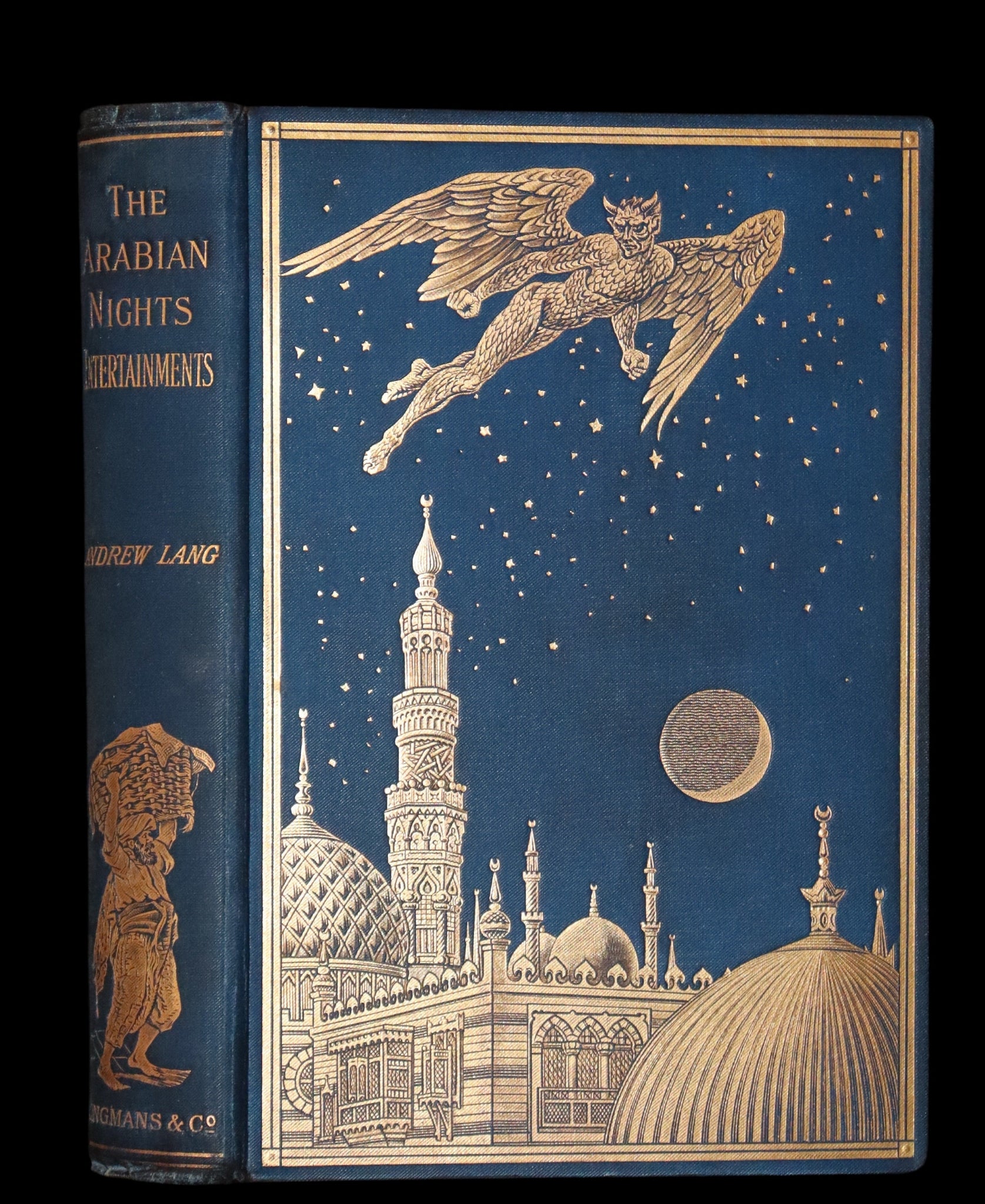 The book: Attractive and very nice First edition of Andrew Lang's Arabian Nights. It is almost impossible to envision what childhood would be like without the enchanting world of the Arabian Nights. Beautiful princesses, genies who emerge from bottles, magic words that open doors to great treasure, giants and dwarves, monsters and magicians, talking birds and beasts, the magical world of medieval Bagdad... The Arabian Nights stories have long been favorites, but unfortunately in their original form they are far too long — and often too erotic — for children. Here are Lang's own versions of Aladdin and the Wonderful Lamp, of Noureddin and the Fair Persian, of Prince Camaralzaman and the Princess Badoura, and of the Enchanted Horse; and the many adventures of Haroun-al-Raschid, Caliph of Bagdad and of Ali Cogia, Merchant of Bagdad. A special treat is the inclusion of the full Voyages of Sindbad the Sailor, which are not usually included in collections of Arabian Nights stories.