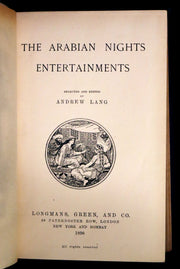 The book: Attractive and very nice First edition of Andrew Lang's Arabian Nights. It is almost impossible to envision what childhood would be like without the enchanting world of the Arabian Nights. Beautiful princesses, genies who emerge from bottles, magic words that open doors to great treasure, giants and dwarves, monsters and magicians, talking birds and beasts, the magical world of medieval Bagdad... The Arabian Nights stories have long been favorites, but unfortunately in their original form they are far too long — and often too erotic — for children. Here are Lang's own versions of Aladdin and the Wonderful Lamp, of Noureddin and the Fair Persian, of Prince Camaralzaman and the Princess Badoura, and of the Enchanted Horse; and the many adventures of Haroun-al-Raschid, Caliph of Bagdad and of Ali Cogia, Merchant of Bagdad. A special treat is the inclusion of the full Voyages of Sindbad the Sailor, which are not usually included in collections of Arabian Nights stories.