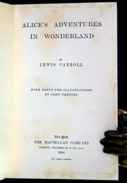 The book: This is a lovely 1898 edition of Alice's Adventures in Wonderland by Lewis Carroll, published by The Macmillan Company. This edition captures the whimsy and enduring appeal of Carroll's classic tale through the masterful illustrations of John Tenniel, who brought the world of Wonderland to life. The original blue cloth binding, with its iconic gilt illustration, makes this edition particularly desirable for collectors. The book retains its charm and is a fine example of late 19th-century children's literature.