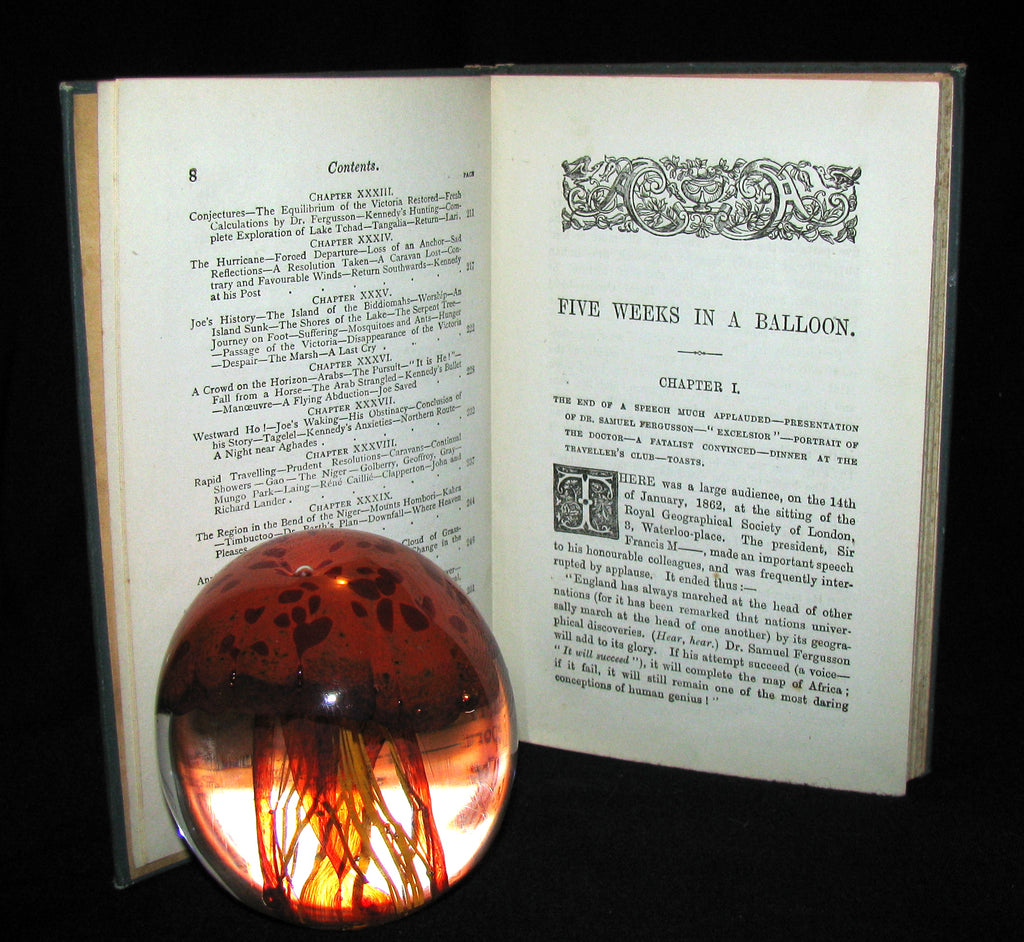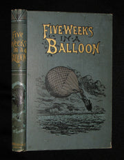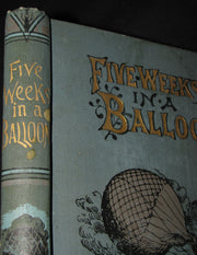 The book : Rare and attractive edition of Five Weeks in a Balloon, or, Journeys and Discoveries in Africa by Three Englishmen (French: Cinq semaines en ballon) , the famous adventure novel by Jules Verne, published in 1863. It is the first novel in which he perfected the "ingredients" of his later work, skillfully mixing a plot full of adventure and twists that hold the reader's interest with passages of technical, geographic, and historic description. The book gives readers a glimpse of the exploration of Africa, which was still not completely known to Europeans of the time, with explorers traveling all over the continent in search of its secrets.