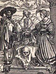 The illustrator: Hans Holbein the Younger (c. 1497 – between 7 October and 29 November 1543) was a German painter and printmaker who worked in a Northern Renaissance style, and is considered one of the greatest portraitists of the 16th century. He also produced religious art, satire, and Reformation propaganda, and he made a significant contribution to the history of book design. He is called "the Younger" to distinguish him from his father Hans Holbein the Elder, an accomplished painter of the Late Gothic school. His Dance of Death (1523–26) refashions the late-medieval allegory of the Danse Macabre as a reformist satire. Holbein's series of woodcuts shows the figure of "Death" in many disguises, confronting individuals from all walks of life. None escape Death's skeleton clutches, even the pious.