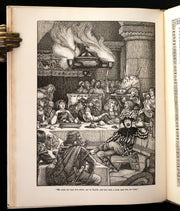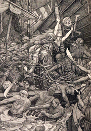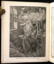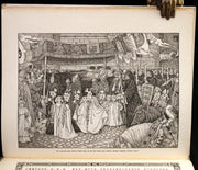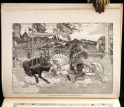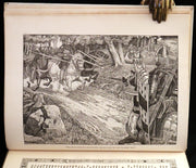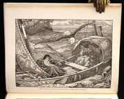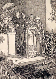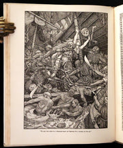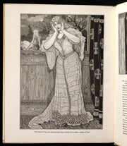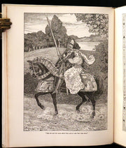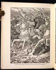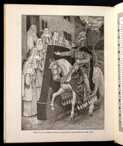 The book: "Idylls of the King" by Lord Alfred Tennyson, illustrated by the Brothers Rhead, is a striking, scarce 1898 first illustrated edition that vividly brings to life Tennyson's epic poem sequence about the legends of King Arthur and his knights. This edition is particularly notable for its luxurious presentation and the extensive decorative work by George Wooliscroft Rhead and Louis Rhead, whose illustrations are heavily inspired by the Arts and Crafts movement, akin to the styles seen in William Morris' Kelmscott Press editions.