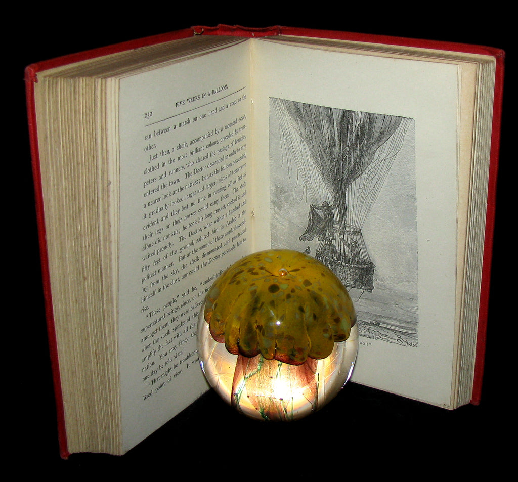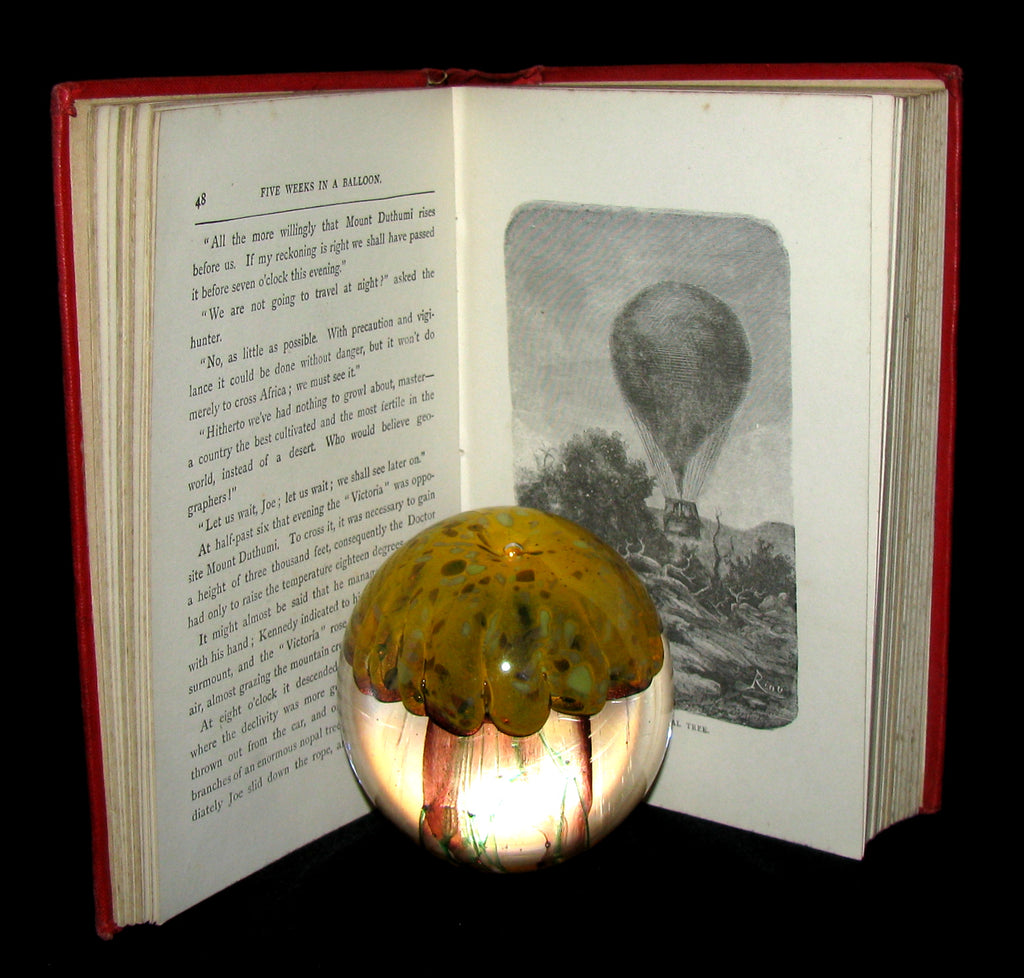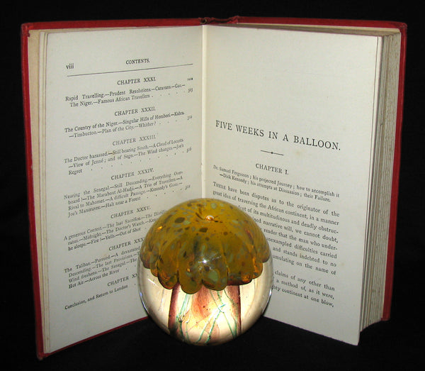 The book : Rare and attractive edition of Five Weeks in a Balloon, or, Journeys and Discoveries in Africa by Three Englishmen (French: Cinq semaines en ballon) , the famous adventure novel by Jules Verne, published in 1863. It is the first novel in which he perfected the "ingredients" of his later work, skillfully mixing a plot full of adventure and twists that hold the reader's interest with passages of technical, geographic, and historic description. The book gives readers a glimpse of the exploration of Africa, which was still not completely known to Europeans of the time, with explorers traveling all over the continent in search of its secrets.