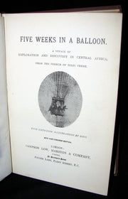 The book : Rare and attractive edition of Five Weeks in a Balloon, or, Journeys and Discoveries in Africa by Three Englishmen (French: Cinq semaines en ballon) , the famous adventure novel by Jules Verne, published in 1863. It is the first novel in which he perfected the "ingredients" of his later work, skillfully mixing a plot full of adventure and twists that hold the reader's interest with passages of technical, geographic, and historic description. The book gives readers a glimpse of the exploration of Africa, which was still not completely known to Europeans of the time, with explorers traveling all over the continent in search of its secrets.