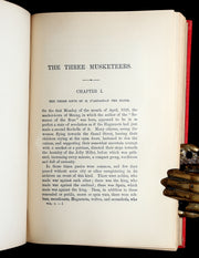 Binding: Attractive and near fine publisher’s original red cloth binding, beautifully stamped in gilt with the iconic musketeers' motto "All for One and One for All" within an elaborate heraldic sword and banner design. Spines gilt-lettered and decorated with fleur-de-lis motifs ( hinges fine, overall slightly scuffed - as shown, slight uniform fading to spine cloth - as shown) under a protective removable mylar cover. Upper edge gilt.