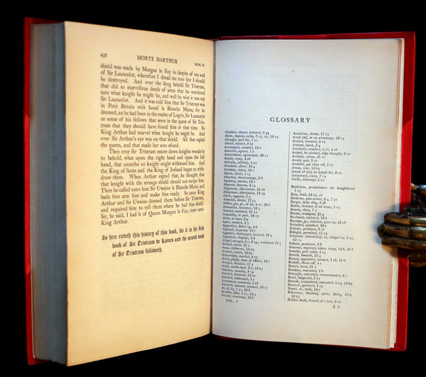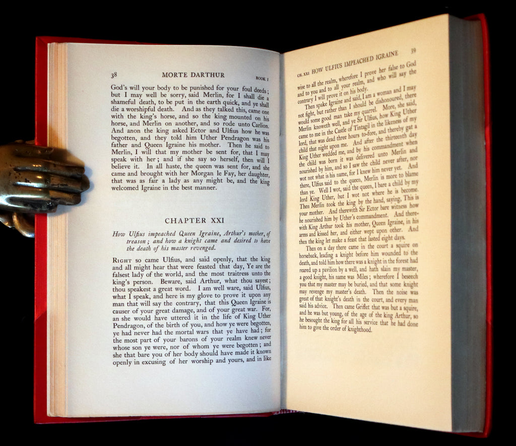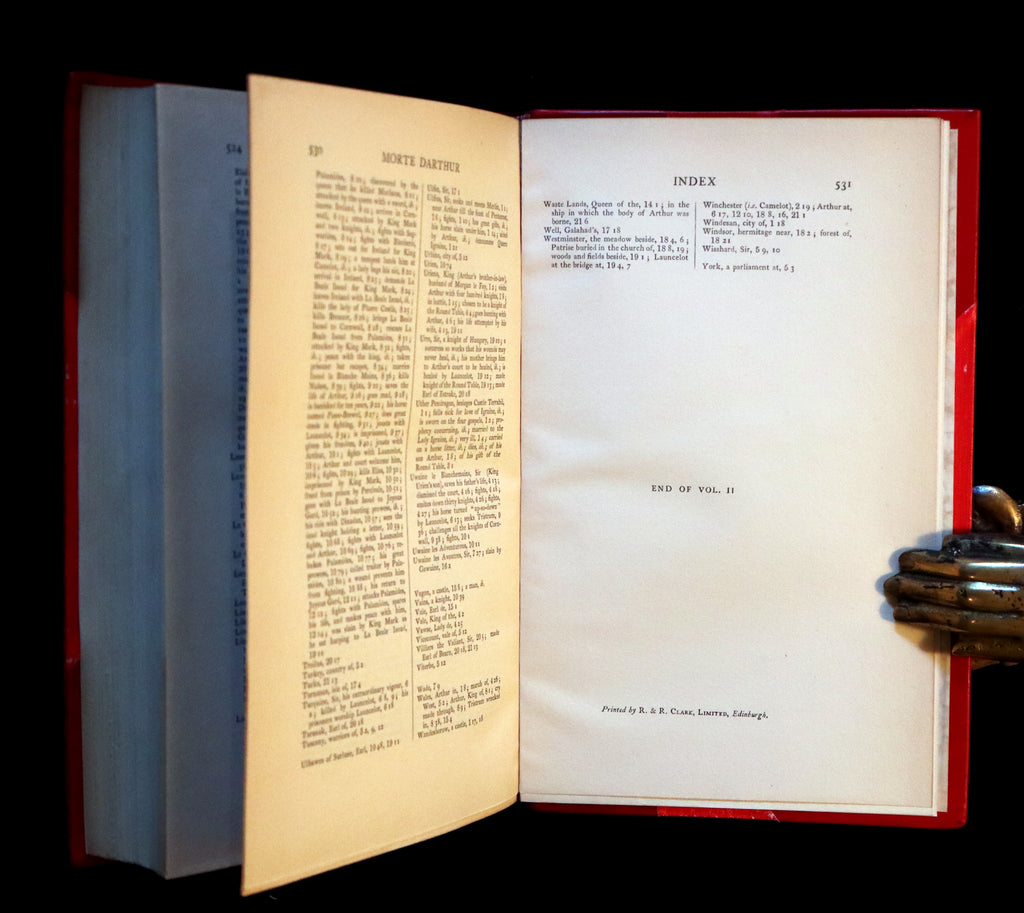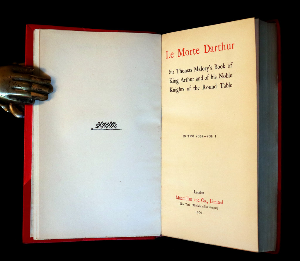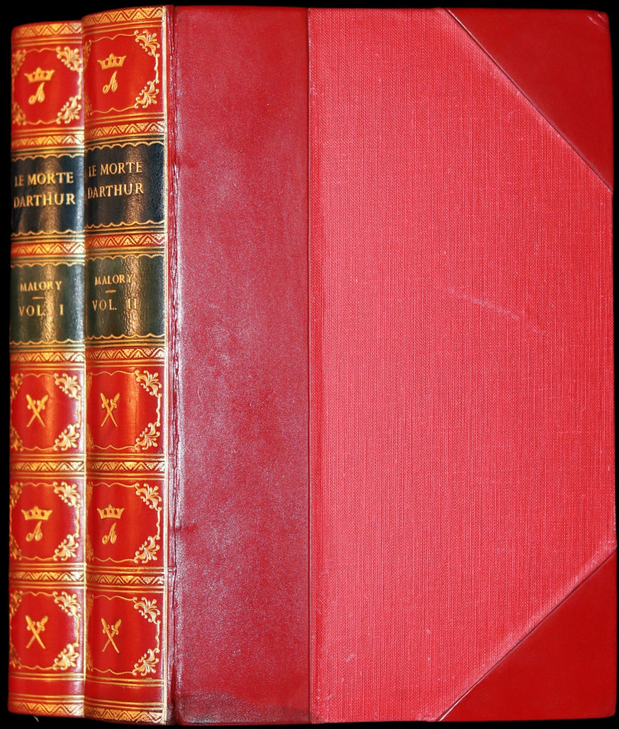 The book set: Attractive edition and scarce in a beautiful Bayntun-Riviere binding of Le Morte d'Arthur (originally spelled Le Morte Darthur, Middle French for "The Death of Arthur") -a reworking by Sir Thomas Malory of existing tales about the legendary King Arthur, Guinevere, Lancelot, Merlin, and the Knights of the Round Table. Malory interpreted existing French and English stories about these figures and adds original material (e.g., the Gareth story). Malory's actual title for the work was The Whole Book of King Arthur and His Noble Knights of the Round Table (The Hoole Book of Kyng Arthur and of His Noble Knyghtes of The Rounde Table), but after Malory's death the publisher changed the title to that commonly known today, which originally only referred to the final volume of the work.