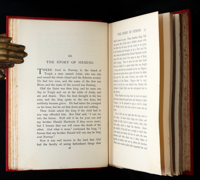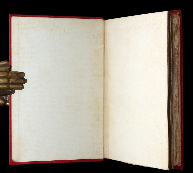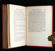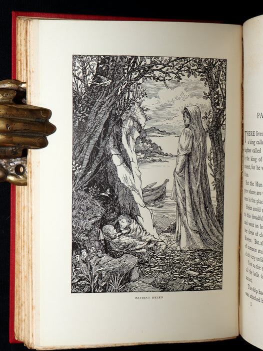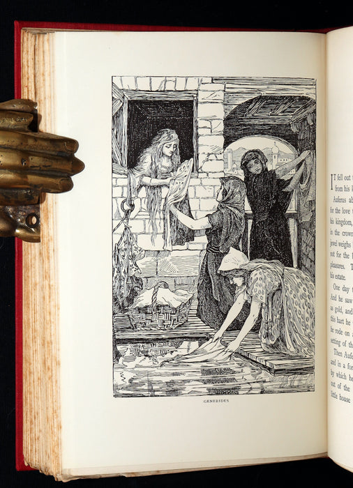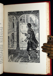 Binding: Attractive and near fine handsome original publisher’s red cloth binding, richly adorned with an elaborate gilt-stamped design on the front cover, depicting two young maidens peering into an ornate vessel. The spine is beautifully decorated with gilt lettering and an intricate illustration of a dragon (hinges fine) under a protective removable mylar cover. Upper edge gilt.