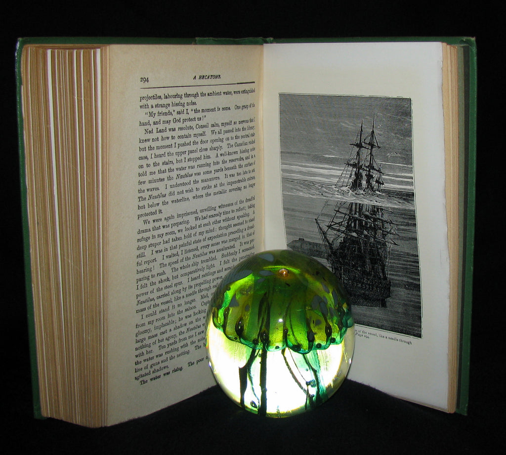 The book : Rare and attractive edition of Twenty Thousand Leagues Under the Sea (French: Vingt mille lieues sous les mers: Tour du monde sous-marin) the classic science fiction novel by French writer Jules Verne published in 1870. The book was highly acclaimed when released and still is now; it is regarded as one of the premiere adventure novels and one of Verne's greatest works, along with Around the World in Eighty Days and Journey to the Center of the Earth. The description of Nemo's ship, called the Nautilus, was considered ahead of its time, as it accurately describes features on submarines, which at the time were very primitive vessels.