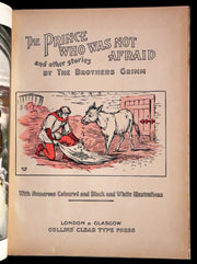 The book: A scarce edition of "The Prince Who Was Not Afraid and Other Stories" by the Brothers Grimm, this collection brings together a selection of enchanting fairy tales that have delighted children and adults alike for generations. Published around 1900 by Collins' Clear-Type Press, this edition is particularly notable for its beautiful illustrations that accompany the text, enhancing the magical and often moralistic stories with visual splendor.
