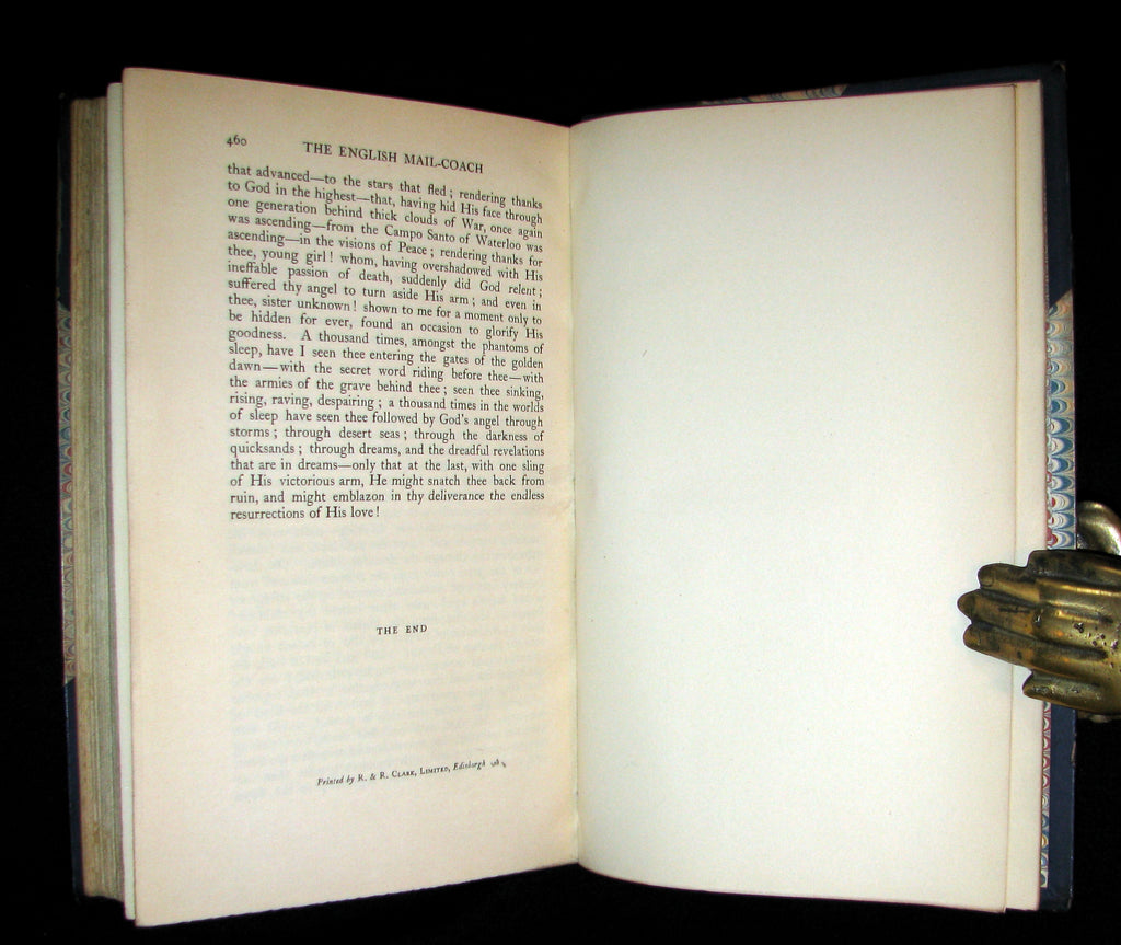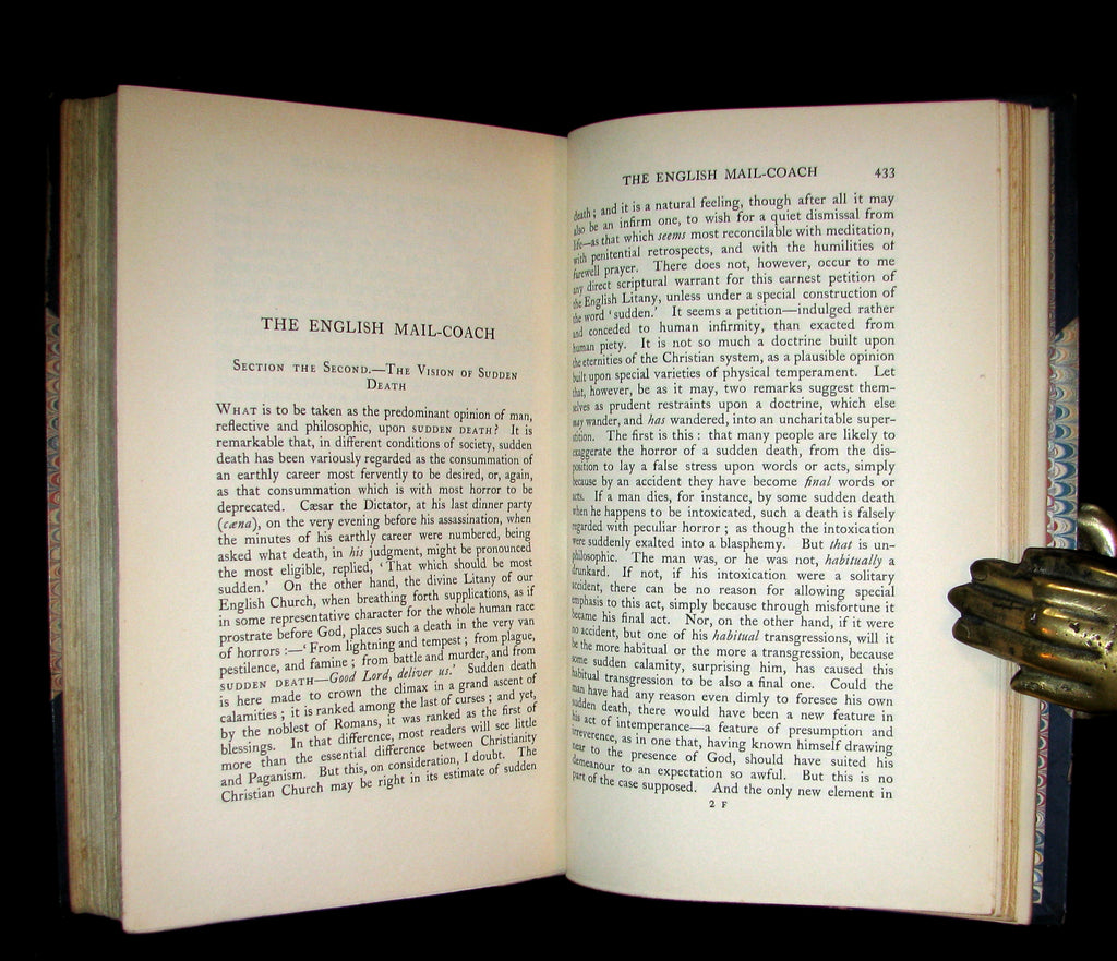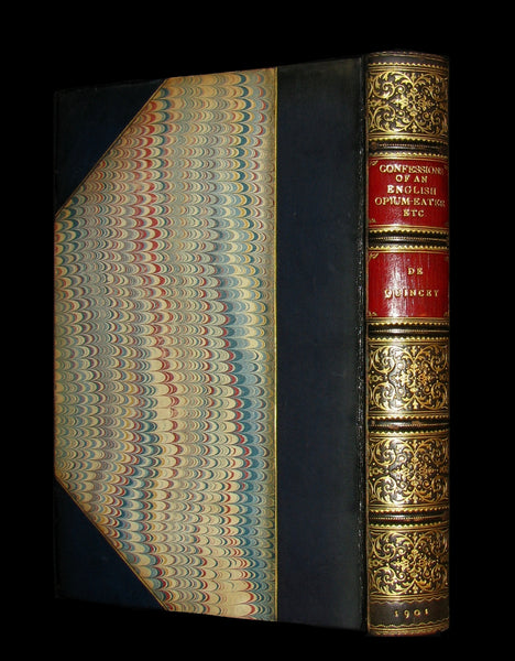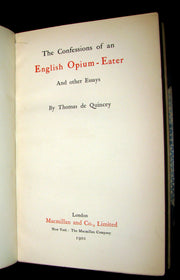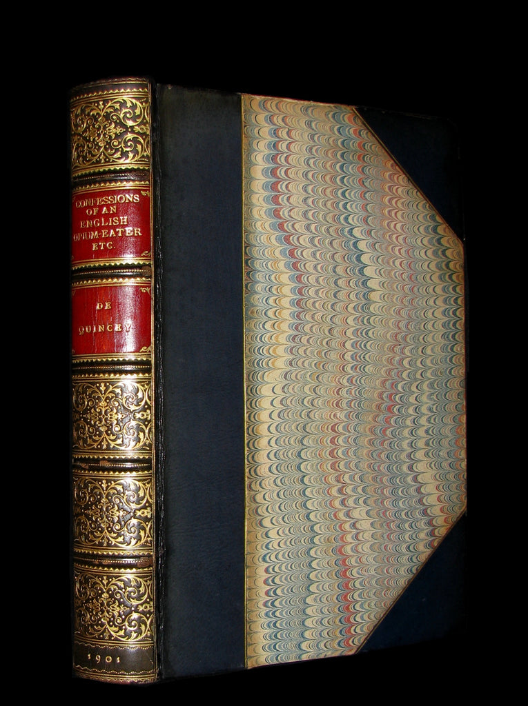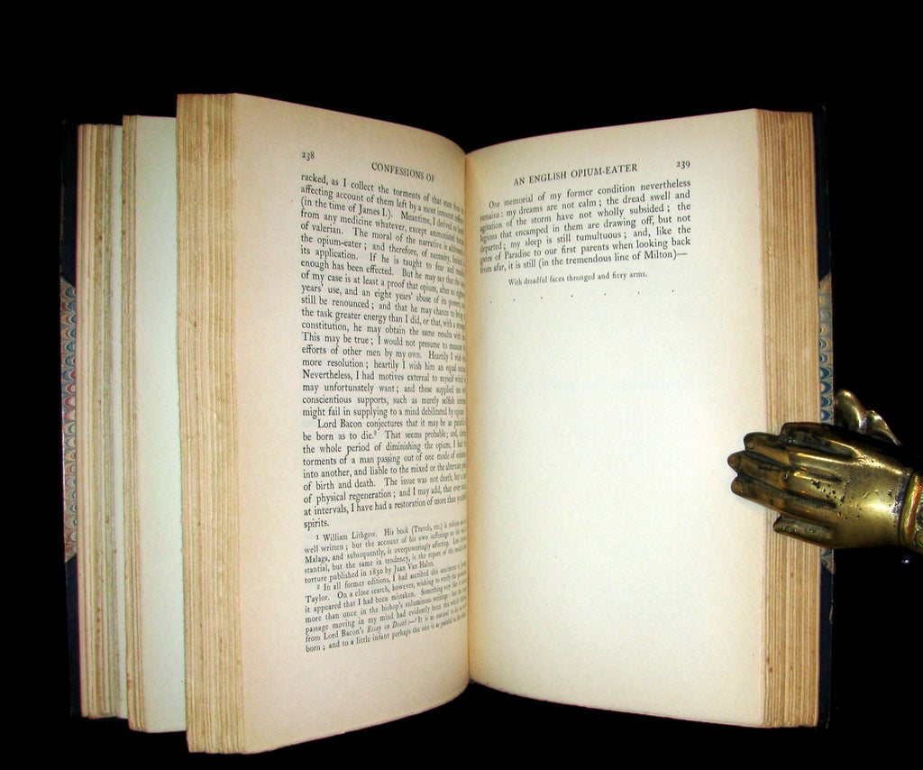 The book: A very attractively bound edition of Confessions of an English Opium-Eater (1821) -- an autobiographical account written by Thomas De Quincey, about his laudanum addiction and its effect on his life. The Confessions was "the first major work De Quincey published and the one which won him fame almost overnight..."