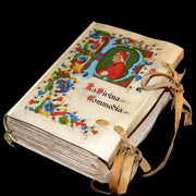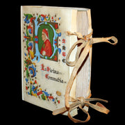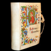 Binding: Attractive, scarce, and fine hand-painted vellum binding finely bound and illuminated by the Giannini Family (hinges fine, original leather ties overall worn and scuffed - as shown, one tie repaired by a previous owner - as shown) under a protective removable mylar cover. An exquisite hand-painted binding!