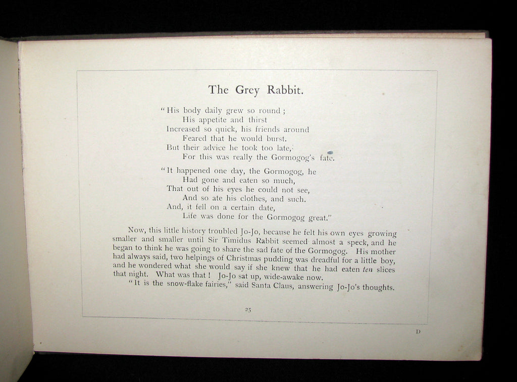 The book: Rare First edition of The Grey Rabbit. " Jo-Jo is lying in his cot, upset because his nurse took away his letter to Santa Claus before it was finished and now won't know what Jo-Jo wants for Christmas. Will his Grey Rabbit be able to get Jo-Jo to Santa Claus so that he can tell him himself?."