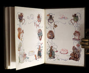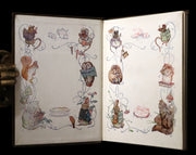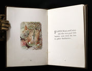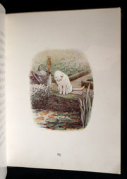 Publisher: London and New York, Frederick Warne and Co., no date (1904 - First edition, seventh or eighth printing according to the endpaper. The right-hand endpaper, introduced for The Tale of Benjamin Bunny. The cat is now brown, and the figure of the guineapig has been added in place of the owl; on the left-hand endpaper, the previous design is reversed, with the white cat in the lower left.). Quinby 2d.