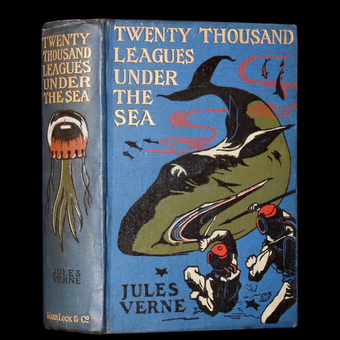 Binding: Attractive and very good original bright blue pictorial cloth binding featuring a stunning underwater scene stamped in gilt, black, red, and olive, with a jellyfish motif to the spine and a dramatic depiction of a whale and divers to the front board. Gilt titles to spine and front (hinges fine, overall slightly worn and scuffed - as shown) under a protective removable mylar cover.