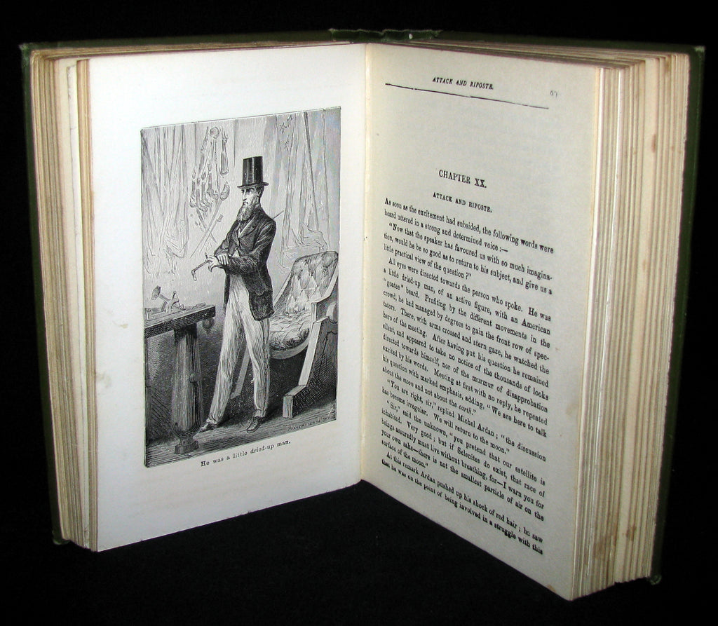 The book : Rare and attractive edition of From the Earth to the Moon (French: De la terre à la lune) is an 1865 novel by Jules Verne. It tells the story of the Baltimore Gun Club, a post-American Civil War society of weapons enthusiasts, and their attempts to build an enormous Columbiad space gun and launch three people—the Gun Club's president, his Philadelphian armor-making rival, and a French poet—in a projectile with the goal of a moon landing. The story is also notable in that Verne attempted to do some rough calculations as to the requirements for the cannon and, considering the comparative lack of any data on the subject at the time, some of his figures are surprisingly close to reality. However, his scenario turned out to be impractical for safe manned space travel since a much longer muzzle would have been required to reach escape velocity while limiting acceleration to survivable limits for the passengers.
