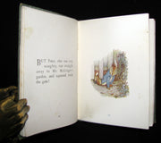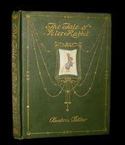 Binding : The scarce first deluxe binding of Peter Rabbit, offered here in green. A Rare find in any condition! An attractive good to very good green boards cloth binding with gilt decoration, upper cover with inset color pictorial label, (hinges fine, overall slightly worn, scuffed and soiled - as shown).