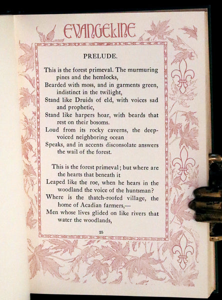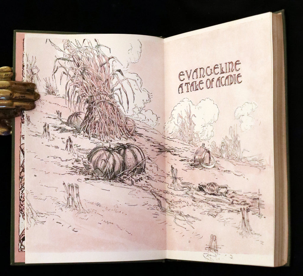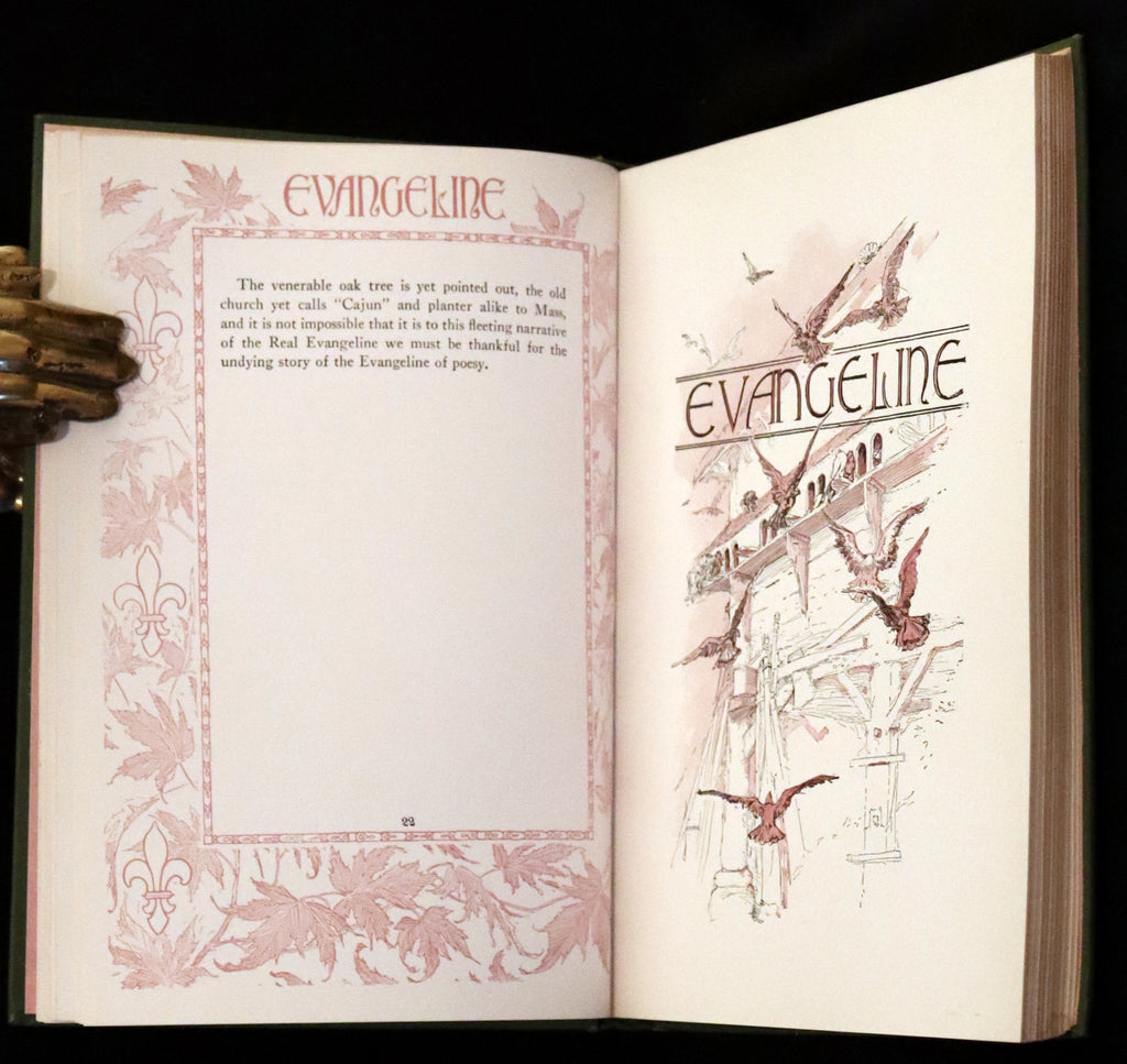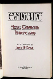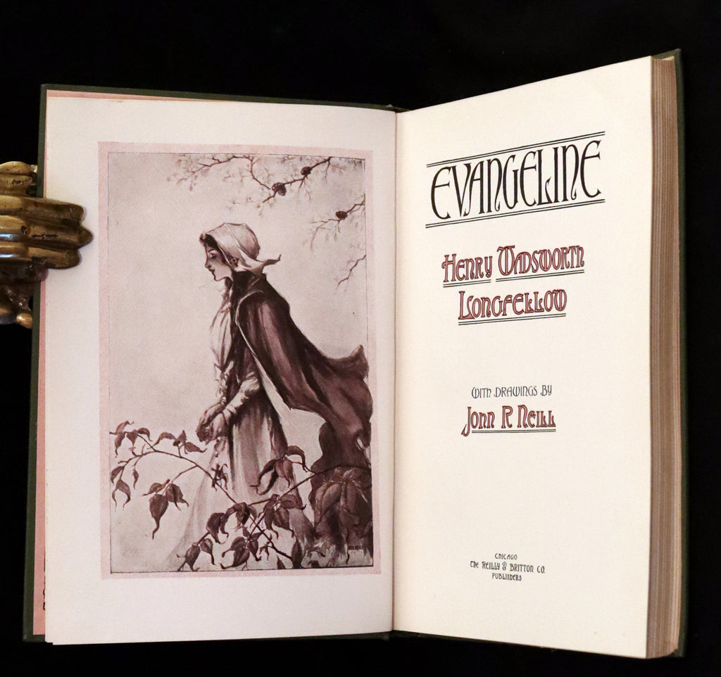 The book: Rare and attractive First illustrated Edition by John Rea Neill of Evangeline, A Tale of Acadie -- an epic poem by the American poet Henry Wadsworth Longfellow, written in English and published in 1847. The poem follows an Acadian girl named Evangeline and her search for her lost love Gabriel, set during the time of the Expulsion of the Acadians.
