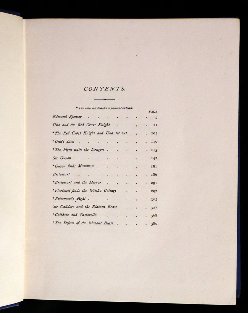 The book: Rare First Edition illustrated by Frank C. Papé of The Gateway to Spenser, Stories from The Faërie Queen. The Faerie Queene is an English epic poem by Edmund Spenser. Books I–III were first published in 1590, and then republished in 1596 together with books IV–VI. The Faerie Queene is notable for its form: it is one of the longest poems in the English language as well as the work in which Spenser invented the verse form known as the Spenserian stanza. On a literal level, the poem follows several knights as a means to examine different virtues, and though the text is primarily an allegorical work, it can be read on several levels of allegory, including as praise (or, later, criticism) of Queen Elizabeth I. In Spenser's "Letter of the Authors", he states that the entire epic poem is "cloudily enwrapped in Allegorical devices", and the aim of publishing The Faerie Queene was to "fashion a gentleman or noble person in virtuous and gentle discipline".