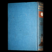 Binding: Attractive and very good original blue cloth binding with an illustrated cover depicting a scene of two men looking out of a spaceship window, accented with black, white, and brown illustrations. The spine includes a gilt title and decorative motif of a rocket launching into the sky (hinges fine, overall slightly worn and scuffed - as shown) under a protective removable mylar cover.