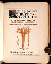 The book: This rare first edition of "Poems by Christina Rossetti" features a collection of her finest poetry, beautifully complemented by the artwork of Florence Harrison, a noted Pre-Raphaelite illustrator. This edition is particularly prized for its lush and elaborate illustrations that embody the aesthetic and emotional depth of Rossetti's poetry. Published around 1910 by Blackie and Son Limited, this volume includes an introduction by Alice Meynell, enhancing the reader's understanding of Rossetti's work and its significance in the context of Victorian literature.