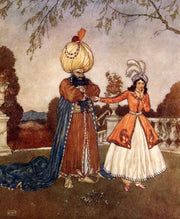 The illustrator: Edmund Dulac (born Edmond Dulac; October 22, 1882 – May 25, 1953) was a French-born, British naturalised magazine illustrator, book illustrator and stamp designer. Born in Toulouse he studied law but later turned to the study of art at the École des Beaux-Arts. He moved to London early in the 20th century and in 1905 received his first commission to illustrate the novels of the Brontë Sisters. During World War I, Dulac produced relief books and when after the war the deluxe children's book market shrank he turned to magazine illustrations among other ventures. He designed banknotes during World War II and postage stamps, most notably those that heralded the beginning of Queen Elizabeth II's reign.