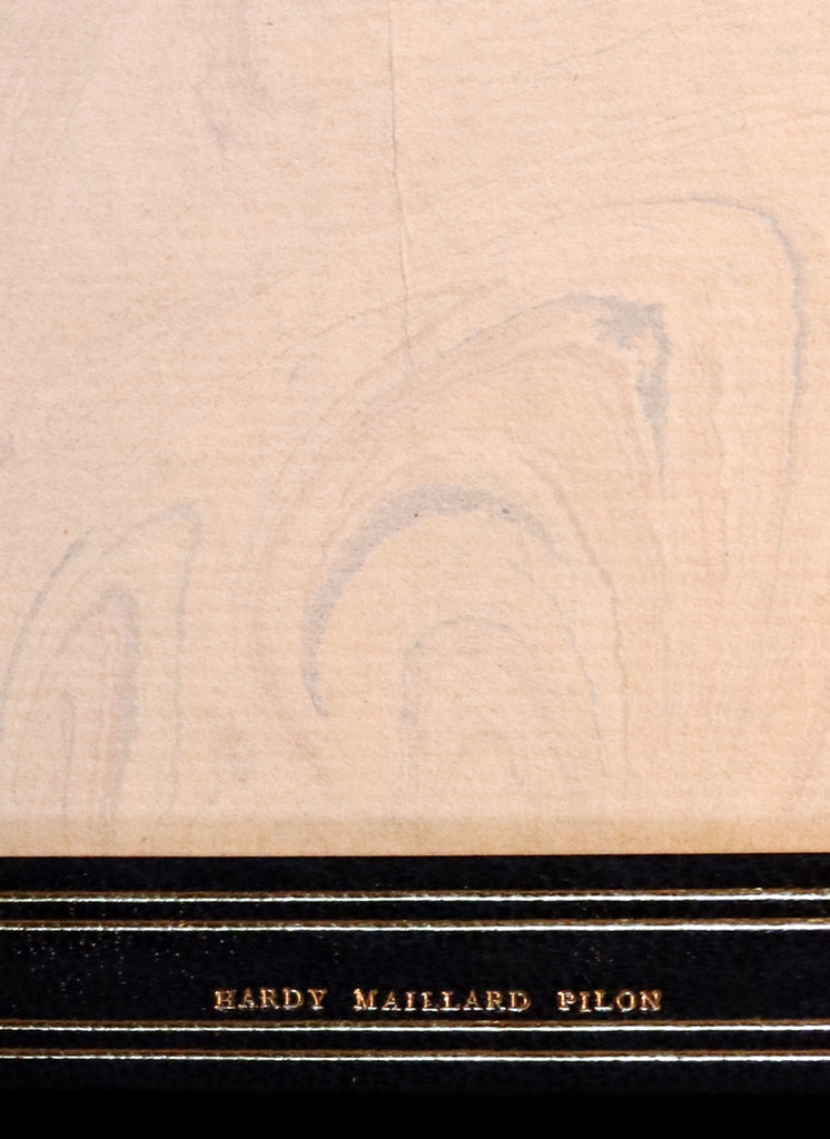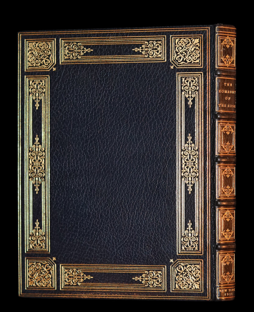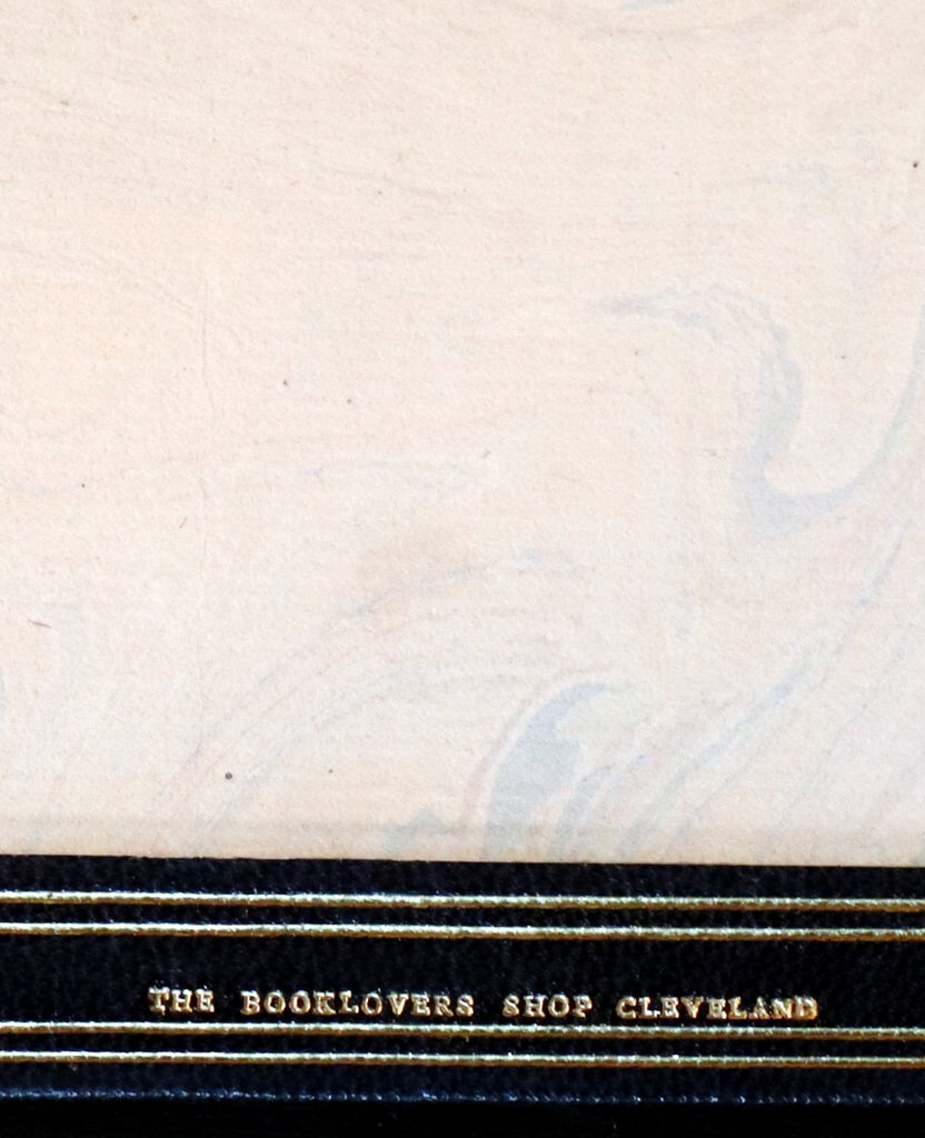 Binding: Very attractive, beautiful, and exquisite FINE full dark blue morocco leather binding, decorated in gilt on spine and covers by Henry Hardy, Leon Maillard, and Gaston Pilon of the Booklover's Shop bindery in Cleveland (hinges fine) under a removable protective mylar cover. One of the nicest Booklover's Shop bindery bindings we ever saw!