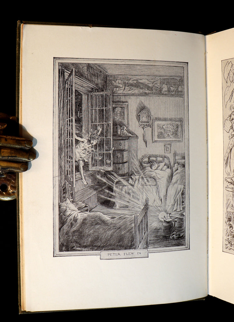 The book: Rare and attractive First American edition of Peter Pan; or, the Boy Who Wouldn't Grow Up or Peter and Wendy is J. M. Barrie's most famous work, in the form of a 1904 play and a 1911 novel. Both versions tell Peter Pan, a mischievous little boy who can fly, and his adventures on the island of Neverland with Wendy Darling and her brothers, the fairy Tinker Bell, the Lost Boys, the Indian princess Tiger Lily, and the pirate Captain Hook. Barrie's friendship inspired the play and novel with the Llewelyn Davies family. Barrie continued to revise the play for years after its debut; the novel reflects one version of the story. A rare find in any condition!