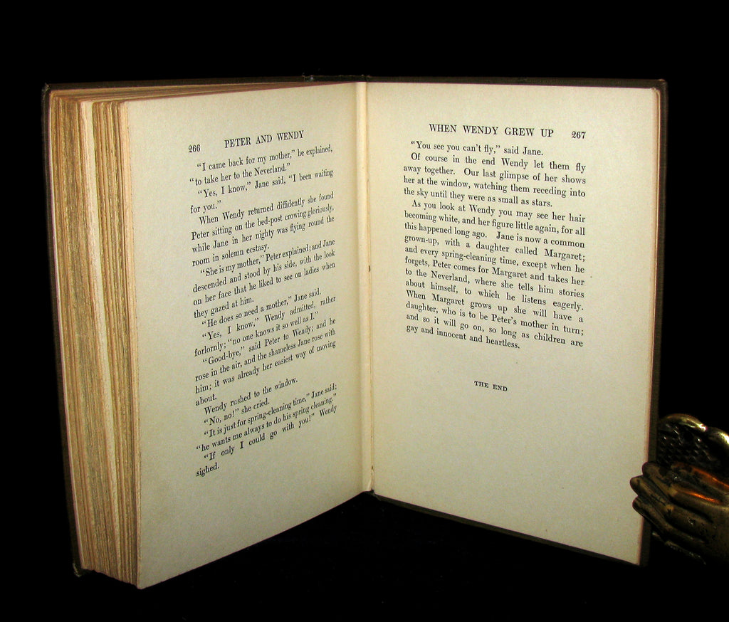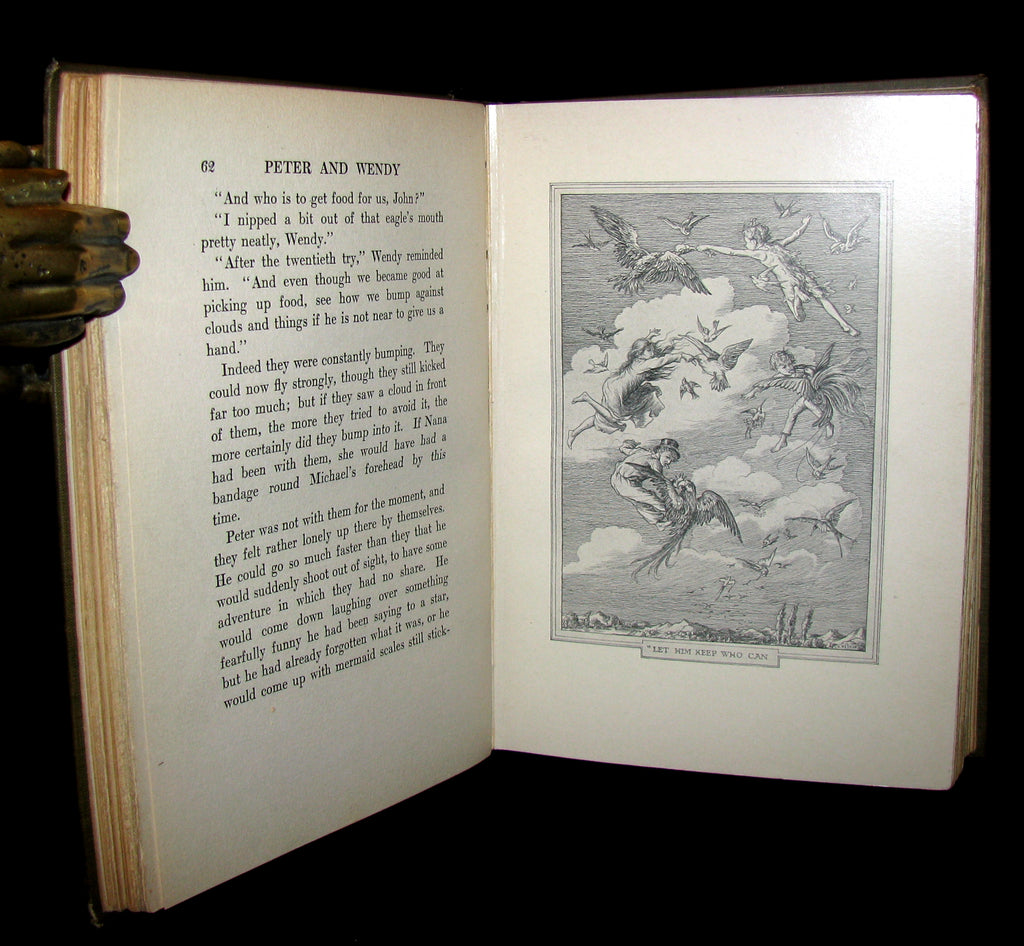 The book : Rare and attractive First American edition of Peter Pan; or, the Boy Who Wouldn't Grow Up or Peter and Wendy is J. M. Barrie's most famous work, in the form of a 1904 play and a 1911 novel. Both versions tell the story of Peter Pan, a mischievous little boy who can fly, and his adventures on the island of Neverland with Wendy Darling and her brothers, the fairy Tinker Bell, the Lost Boys, the Indian princess Tiger Lily, and the pirate Captain Hook. The play and novel were inspired by Barrie's friendship with the Llewelyn Davies family. Barrie continued to revise the play for years after its debut; the novel reflects one version of the story. A rare find in any condition!