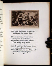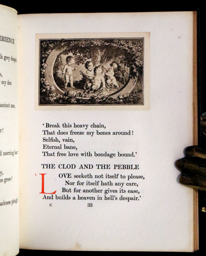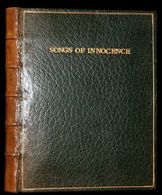 The book: A beautifully illustrated edition bound in morocco of Songs of Innocence and of Experience -- a collection of illustrated poems by William Blake. It appeared in two phases: a few first copies were printed and illuminated by Blake himself in 1789; five years later, he bound these poems with a set of new poems in a volume titled Songs of Innocence and of Experience Shewing the Two Contrary States of the Human Soul.