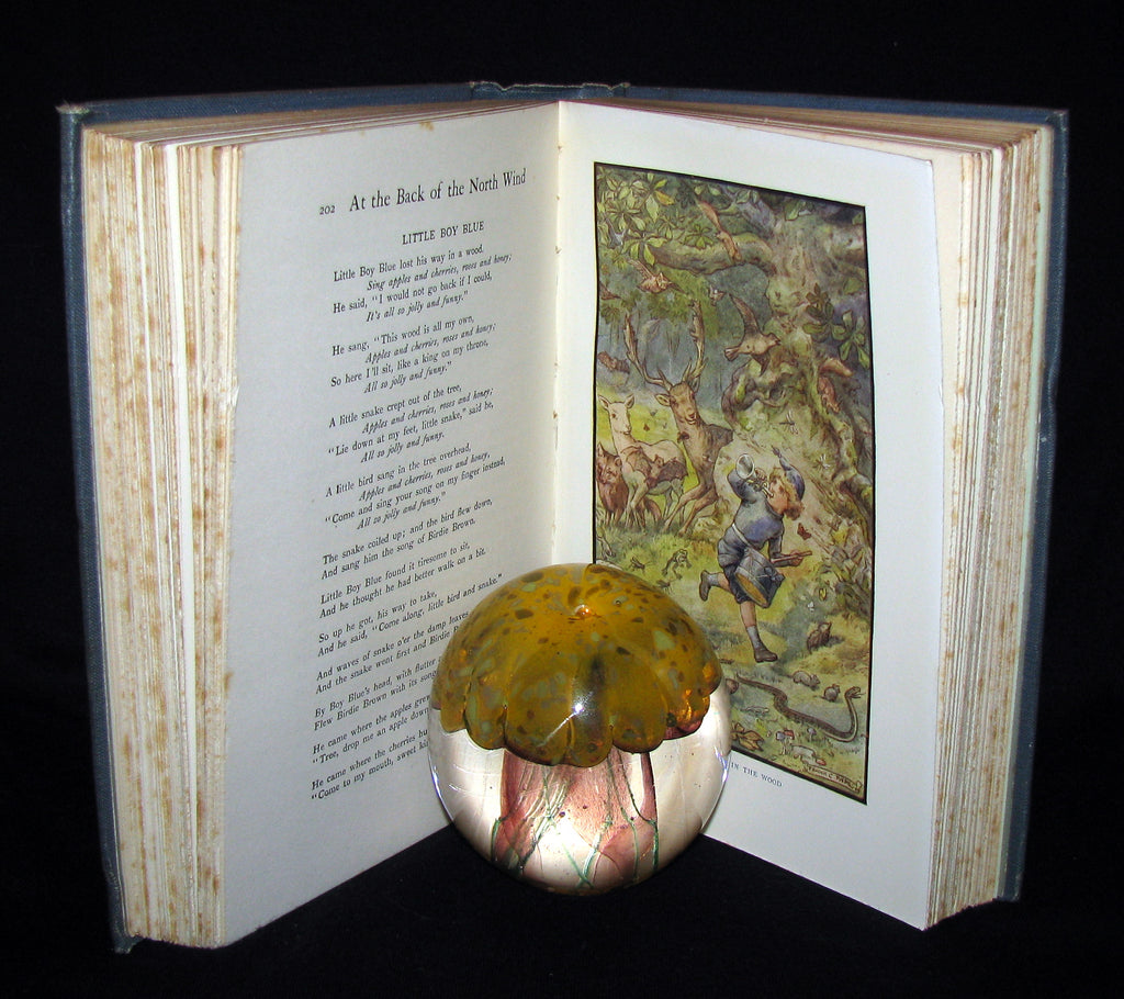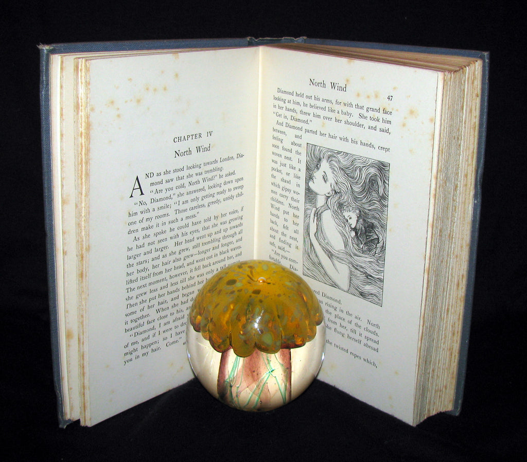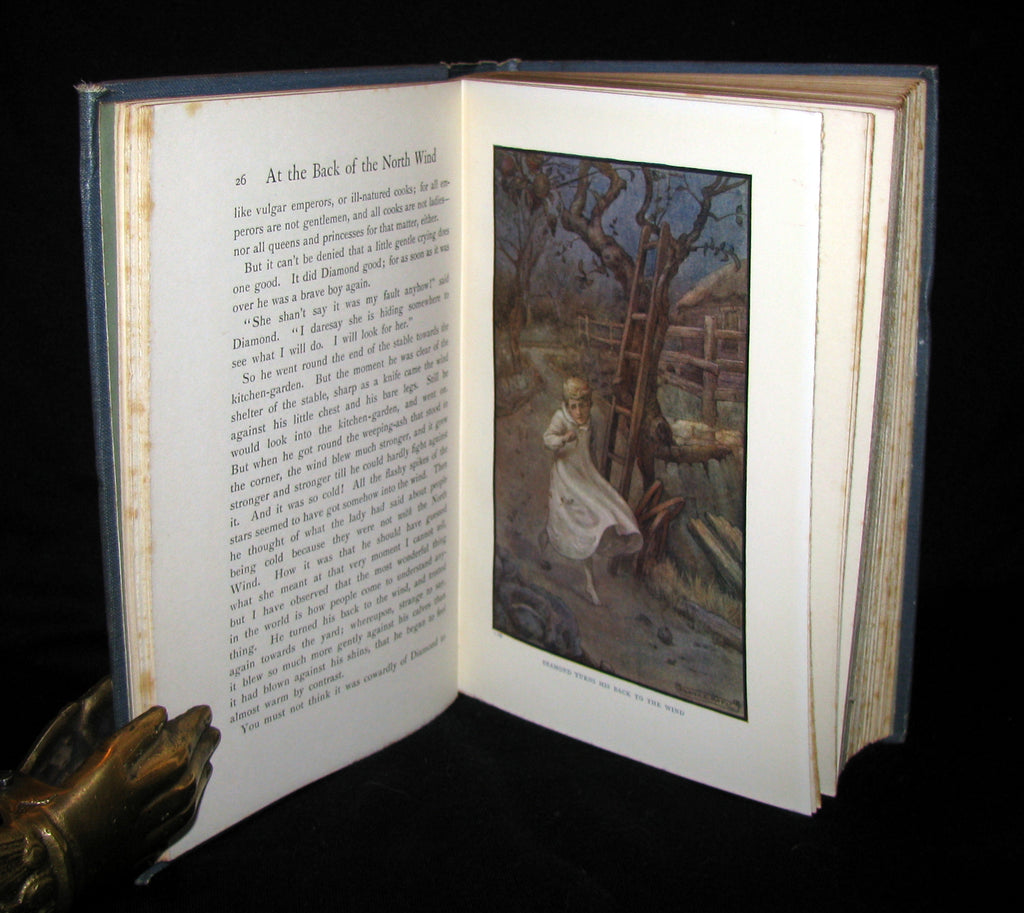 The book: Rare and attractive edition of At the Back of the North Wind -- a children's book written by Scottish author George MacDonald. It was serialized in the children's magazine Good Words for the Young beginning in 1868 and was published in book form in 1871. It is a fantasy centered on a boy named Diamond and his adventures with the North Wind. Diamond travels together with the mysterious Lady North Wind through the nights. The book includes the fairy tale Little Daylight, which has been pulled out as an independent work, or separately, added to other collections of his fairy tales.