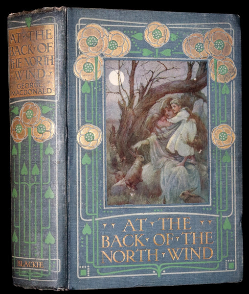 The book: A timeless edition of George MacDonald's AT THE BACK OF THE NORTH WIND, a classic children's tale of fantasy and adventure. This particular Blackie edition, distinguished by its gilt roses on the front cover, is a rare find for collectors and enthusiasts of the Art Nouveau period.