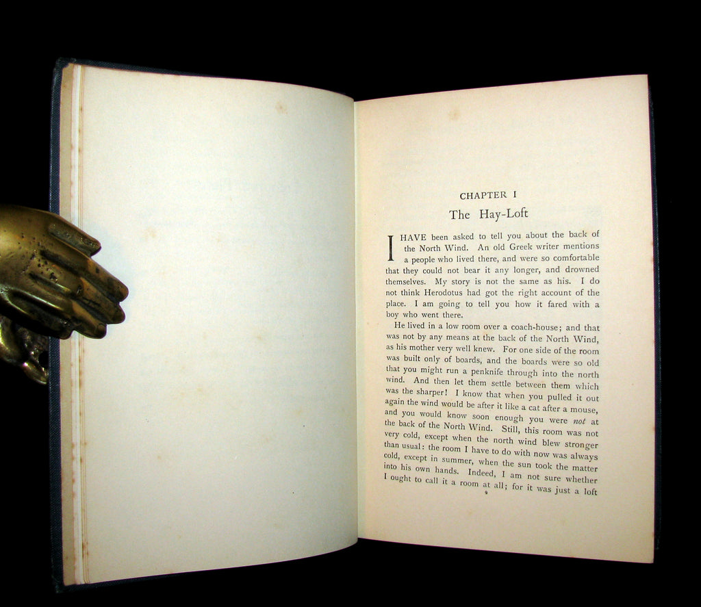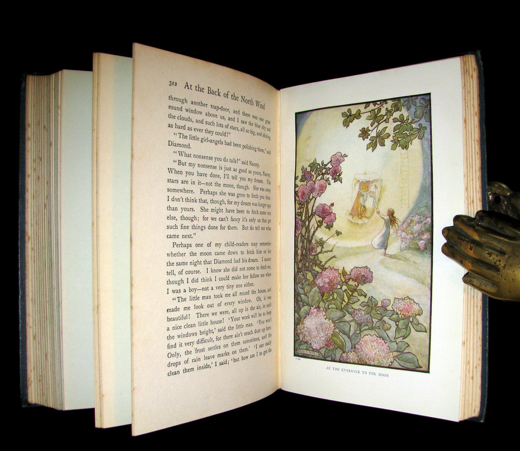 The book : Rare and attractive edition of At the Back of the North Wind -- a children's book written by Scottish author George MacDonald. It was serialized in the children's magazine Good Words for the Young beginning in 1868 and was published in book form in 1871. It is a fantasy centered on a boy named Diamond and his adventures with the North Wind. Diamond travels together with the mysterious Lady North Wind through the nights. The book includes the fairy tale Little Daylight, which has been pulled out as an independent work, or separately, added to other collections of his fairy tales.