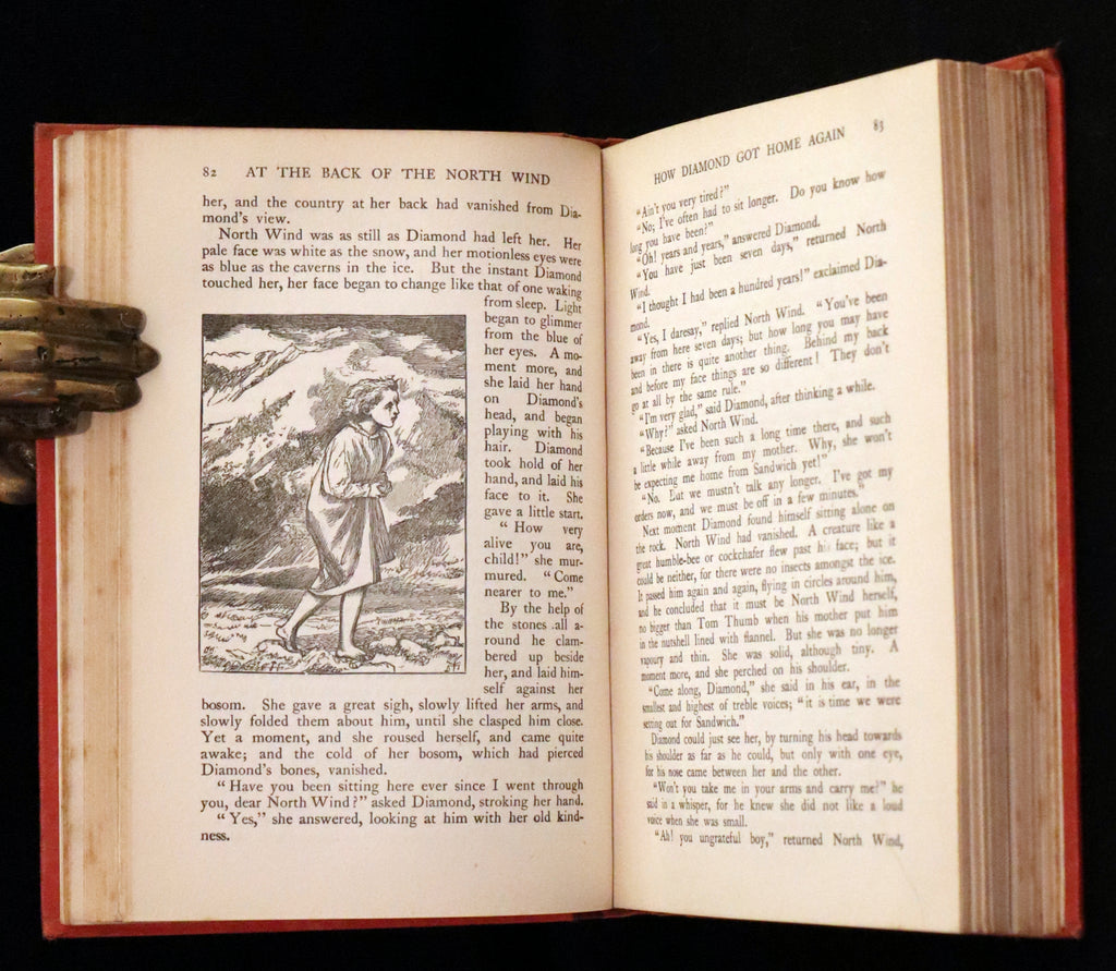The book: Scarce binding variant and attractive edition of At the Back of the North Wind -- a children's book written by Scottish author George MacDonald. It was serialized in the children's magazine Good Words for the Young beginning in 1868 and was published in book form in 1871. It is a fantasy centered on a boy named Diamond and his adventures with the North Wind. Diamond travels together with the mysterious Lady North Wind through the nights. The book includes the fairy tale Little Daylight, which has been pulled out as an independent work, or separately, added to other collections of his fairy tales.