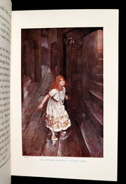 The book: Scarce and attractive edition of The Princess and the Goblin -- a children's fantasy novel by George MacDonald. It was published in 1872 by Strahan & Co., with black-and-white illustrations by Arthur Hughes. ... Summary: Eight-year-old Princess Irene lives a lonely life in a castle in a wild, desolate, mountainous kingdom, with only her nursemaid, Lootie, for company. Her father, the king, is normally absent, and her mother is dead. Unknown to her, the nearby mines are inhabited by a race of goblins, long banished from the kingdom and now anxious to take revenge on their human neighbours. One rainy day, the princess explores the castle and discovers a beautiful, mysterious lady, who identifies herself as Irene's namesake and great-great-grandmother. The next day, Princess Irene persuades her nursemaid to take her outside. After dark they are chased by goblins and rescued by a young miner, Curdie, whom Irene befriends. At work with the rest of the miners, Curdie overhears the goblins talking, and their conversation reveals to Curdie the secret weakness of goblin anatomy: they have very soft, vulnerable feet. Curdie sneaks into the Great Hall of the goblin palace to eavesdrop on their general meeting, and hears that the goblins intend to flood the mine if a certain other part of their plan should fail. He later conveys this news to his father. In the palace, Princess Irene injures her hand, which her great-great-grandmother heals. A week later Irene is about to see her great-great-grandmother again, but is frightened by a long-legged cat and escapes up the mountain; whereupon the light from her great-great-grandmother's tower leads her home, where her great-great-grandmother gives Irene a ring attached to a thread invisible except to herself, which thereafter connects her constantly to home.