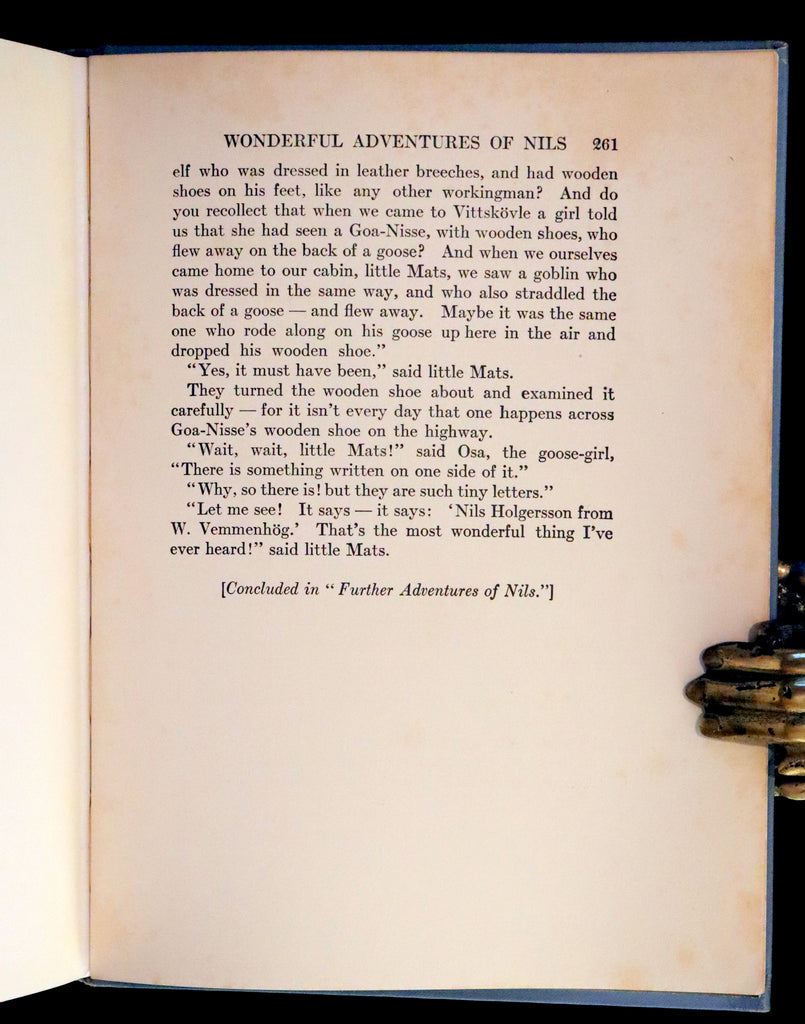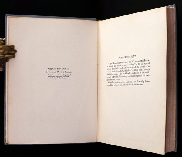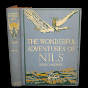 The book: Rare and Nice First American illustrated Edition by Mary Hamilton Frye of The Wonderful Adventures of Nils (Swedish: Nils Holgerssons underbara resa genom Sverige, literally Nils Holgersson's wonderful journey across Sweden) is a work of fiction by the Swedish writer Selma Lagerlöf, the first woman to receive the Nobel Prize in literature. It was originally published in two books, 1906 and 1907, and was first published in English as The Wonderful Adventures of Nils (1907) and The Further Adventures of Nils (1911). The two parts are later usually published together, in English as The Wonderful Adventures of Nils, but that name may also refer to the first part alone.
