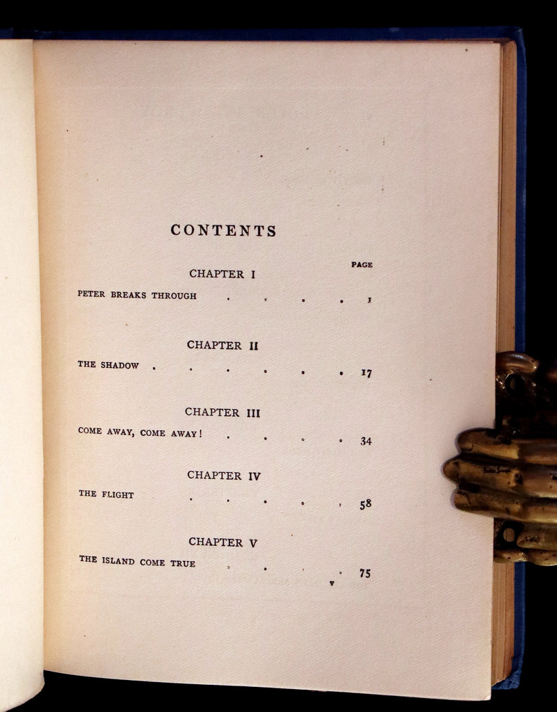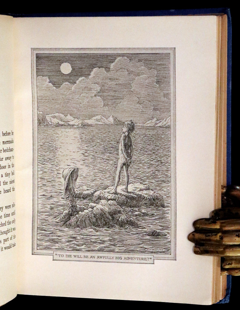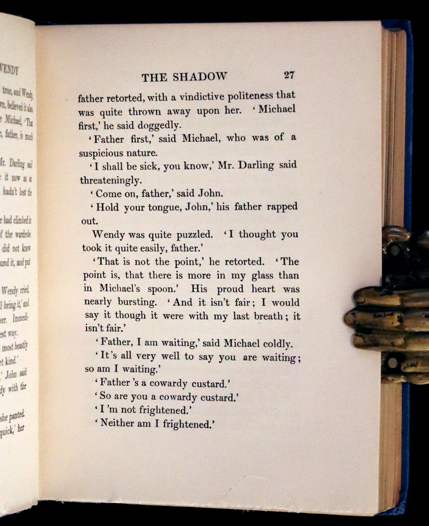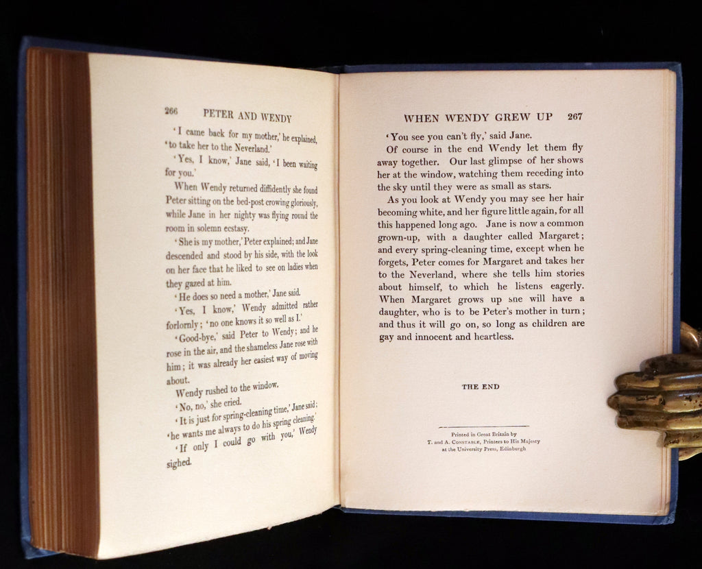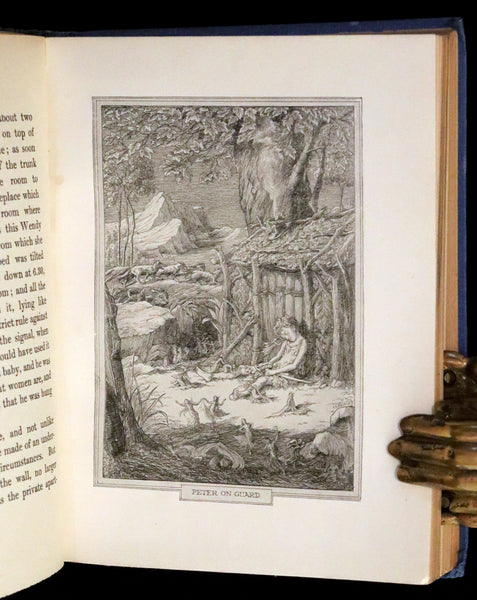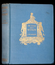 The book: Rare and attractive "blue" edition of Peter Pan; or, the Boy Who Wouldn't Grow Up or Peter and Wendy is J. M. Barrie's most famous work, in the form of a 1904 play and a 1911 novel. Both versions tell Peter Pan, a mischievous little boy who can fly, and his adventures on the island of Neverland with Wendy Darling and her brothers, the fairy Tinker Bell, the Lost Boys, the Indian princess Tiger Lily, and the pirate Captain Hook. Barrie's friendship inspired the play and novel with the Llewelyn Davies family. Barrie continued to revise the play for years after its debut; the novel reflects one version of the story. A rare find in any condition!