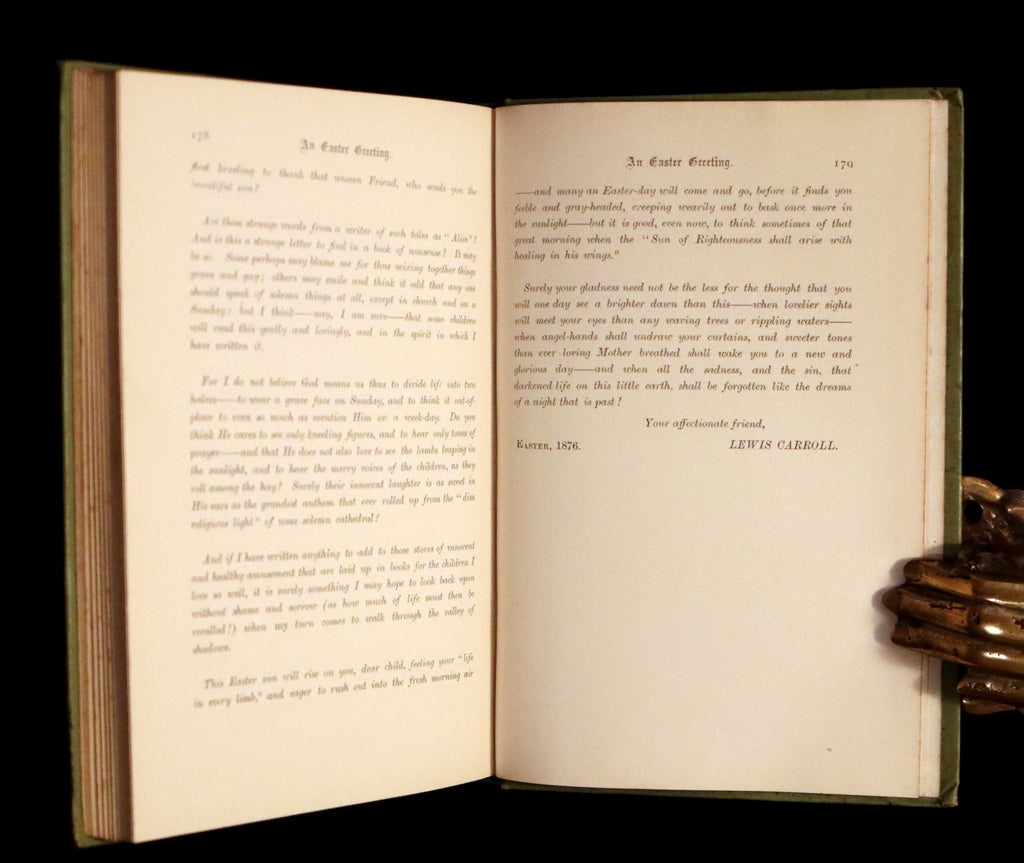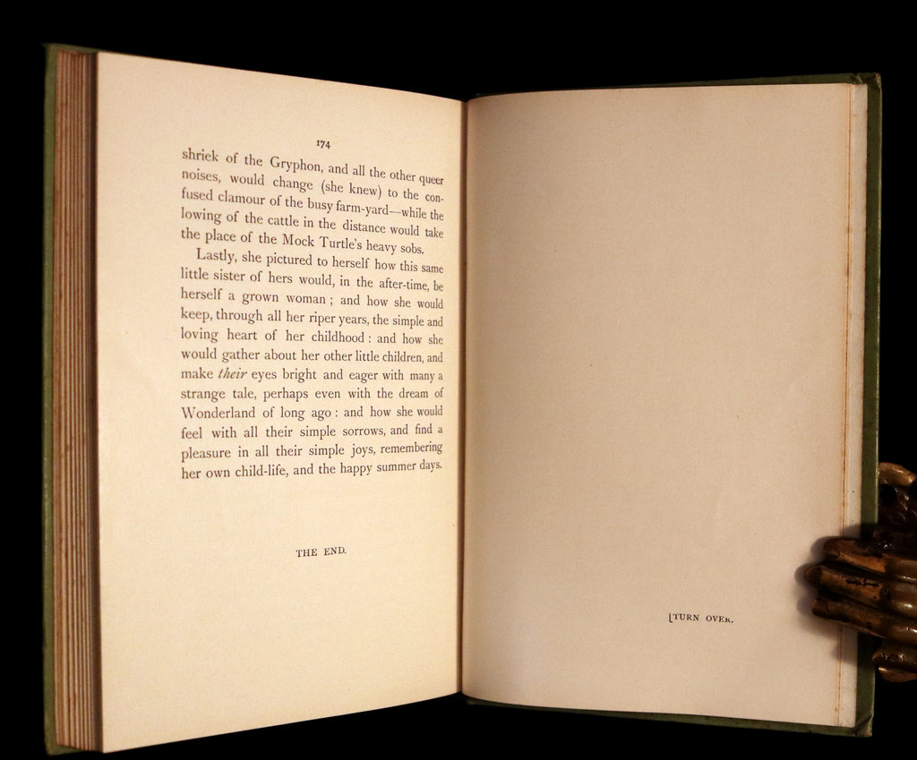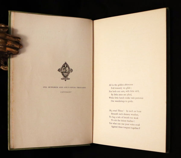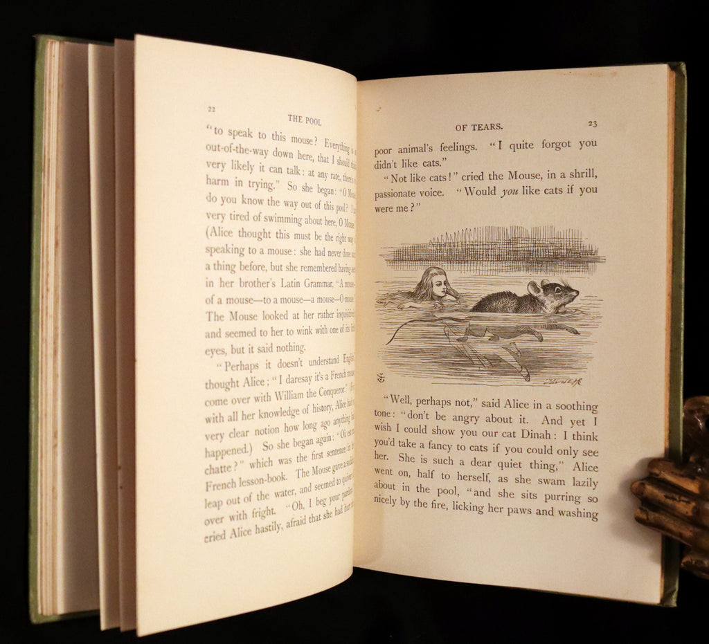 The book: Rare 1912 People's edition of Alice's Adventures in Wonderland (commonly shortened to Alice in Wonderland) -- an 1865 novel written by English author Charles Lutwidge Dodgson under the pseudonym Lewis Carroll. It tells of a girl named Alice falling through a rabbit hole into a fantasy world populated by peculiar, anthropomorphic creatures. The tale plays with logic, giving the story lasting popularity with adults as well as with children. It is considered to be one of the best examples of the literary nonsense genre. Its narrative course and structure, characters and imagery have been enormously influential in both popular culture and literature, especially in the fantasy genre.