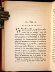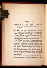 The book: Attractive First Edition of this classic mythology anthology regarding werewolves. There is scarcely a country in the world in which belief in a werewolf, or in some other form of lycanthropy, has not once existed, though it may have ceased to exist now. But whereas in some countries the werewolf is considered wholly physical, in others it is looked upon as partly, if not entirely, superphysical. And whilst in some countries, it is restricted to the male sex, in others it is confined to the female; and, again, in others, it is to be met within both sexes. A werewolf is a mythological or folkloric human with the ability to shapeshift into a wolf (or, especially in modern film, a therianthropic hybrid wolflike creature), either purposely or after being placed under a curse or affliction (often a bite or scratch from another werewolf). Early sources for belief in this ability or affliction, called lycanthropy are Petronius (27–66) and Gervase of Tilbury (1150–1228). The werewolf is a widespread concept in European folklore, existing in many variants, which are related by a common development of a Christian interpretation of underlying European folklore developed during the medieval period.