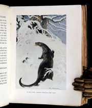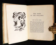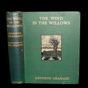 The book Rare First UK illustrated Bransom edition of The Wind in the Willows -- a children's book by Scottish novelist Kenneth Grahame, first published in 1908. Alternatingly slow-moving and fast-paced, it focuses on four anthropomorphized animals: Mole, Rat (a European water vole), Toad, and Badger. They live in a pastoral version of Edwardian England. In 1908, Grahame retired from his position as secretary of the Bank of England. He moved back to Berkshire, where he had lived as a child, and spent his time by the River Thames, doing much as the animal characters in his book do – to quote, "simply messing about in boats" – and expanding the bedtime stories he had earlier told his son Alastair into a manuscript for the book.
