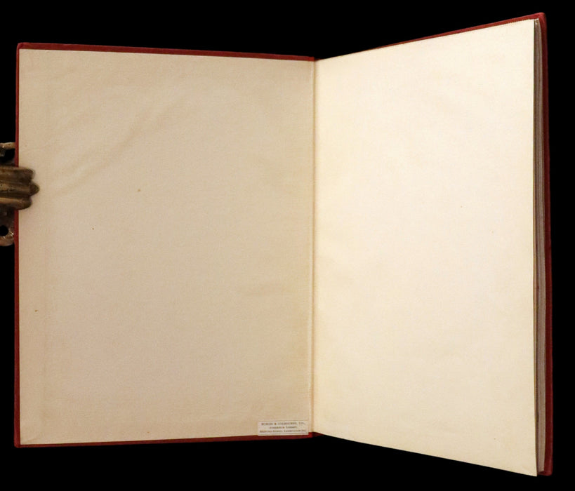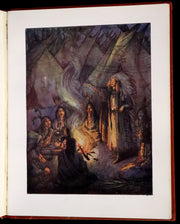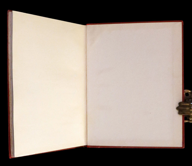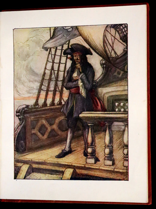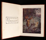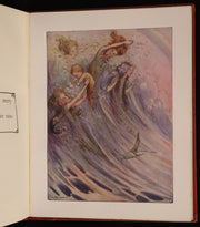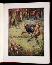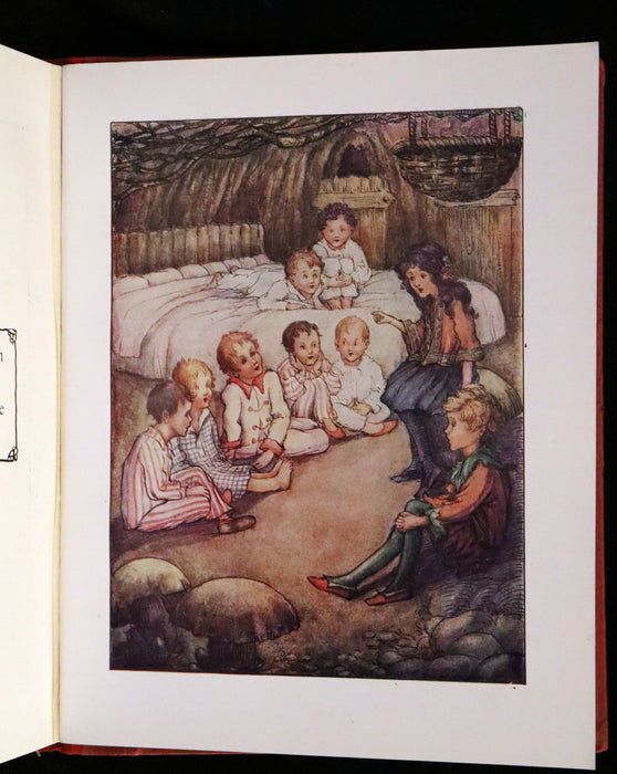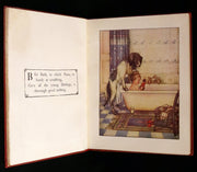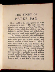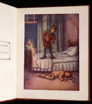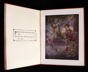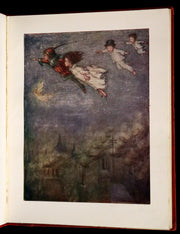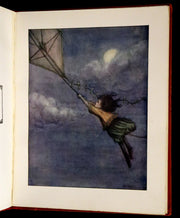 Binding: Attractive and very good original publisher’s red cloth binding, richly decorated with gilt lettering and embossed fairy illustrations. The front cover features an enchanting color plate of Peter Pan playing his pipes, surrounded by fairies, set within a striking red and gold border. The spine is elegantly lettered in gilt (hinges fine, overall slightly worn and scuffed - as shown) under a protective removable mylar cover.