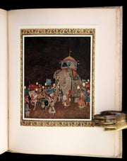 The book: Rare and Nice Hodder and Stoughton First Dulac Signed Limited Edition (#430 of 750 copies) of the Princess Badoura. A Tale from the Arabian Nights. Retold by Laurence Housman. In the Tales of the Arabian Nights, Badoura is a princess of China and the most beautiful woman ever seen on the earth. She magically falls in love in her sleep with Prince Camar of Persia thanks to the supernatural antics of two genies, who boast of their rival beauty. In defiance of their families, the young couple steadfastly refuses to marry anyone else until they are reunited after a quest for each other across Arabia. Their dreams come true, and the princess travels to her wedding in great splendor on the back of an elephant. This enchanting story is here wonderfully illustrated and signed by Edmund Dulac!