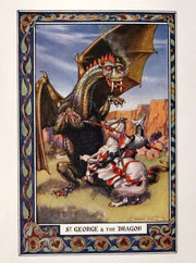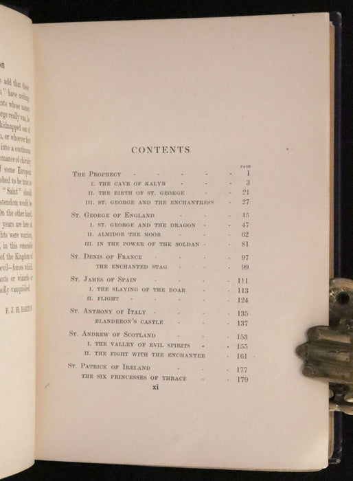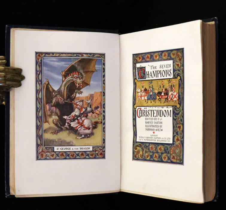 The book: The Seven Champions of Christendom is a classic retelling of the legendary tales of St. George of England, St. Denis of France, St. James of Spain, St. Anthony of Italy, St. Andrew of Scotland, and St. Patrick of Ireland. These chivalric stories, rich with adventure, dragons, and heroic deeds, have inspired readers for centuries. This edition, edited by F. J. Harvey Darton, is particularly notable for its striking illustrations by Norman Ault and its sumptuously designed cover, making it a valuable collector’s item.