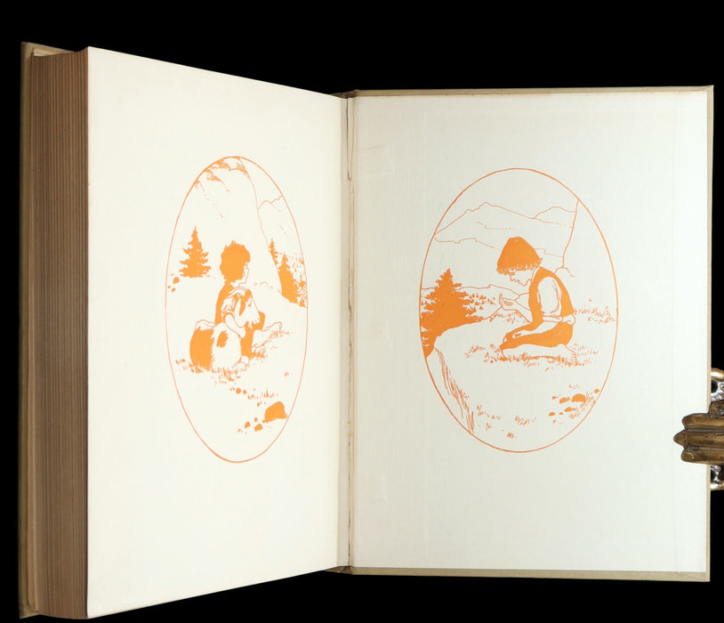 Illustrations: Complete with 14 full-page color plates by Maria L. Kirk, including the frontispiece. The illustrations are vibrant, capturing the Alpine spirit and innocence of the tale. Orange silhouette illustrations also adorn the endpapers and chapter headings.